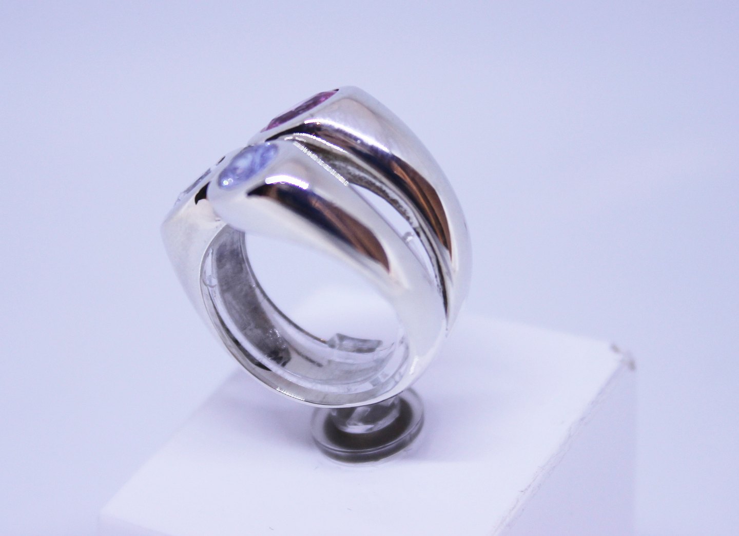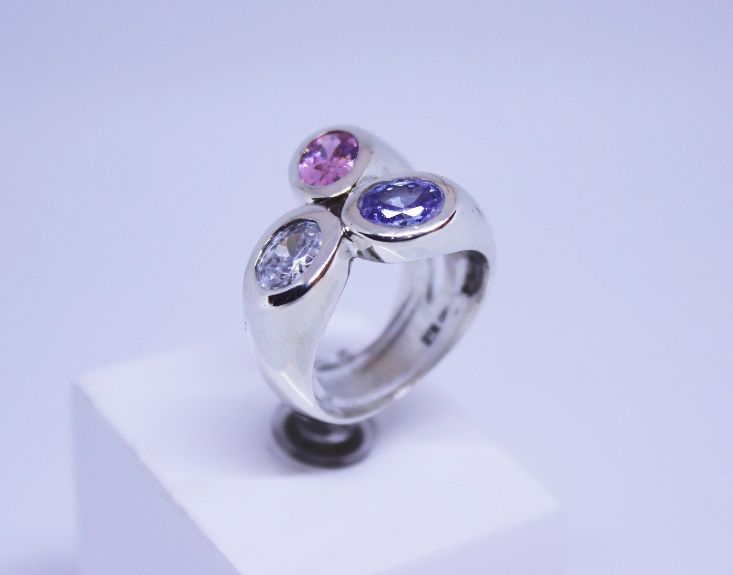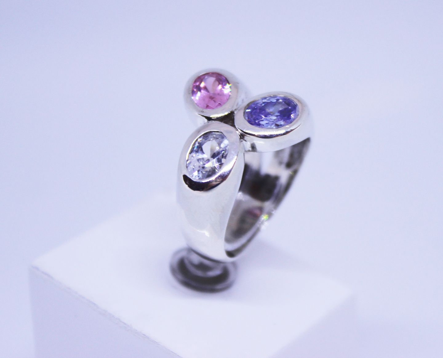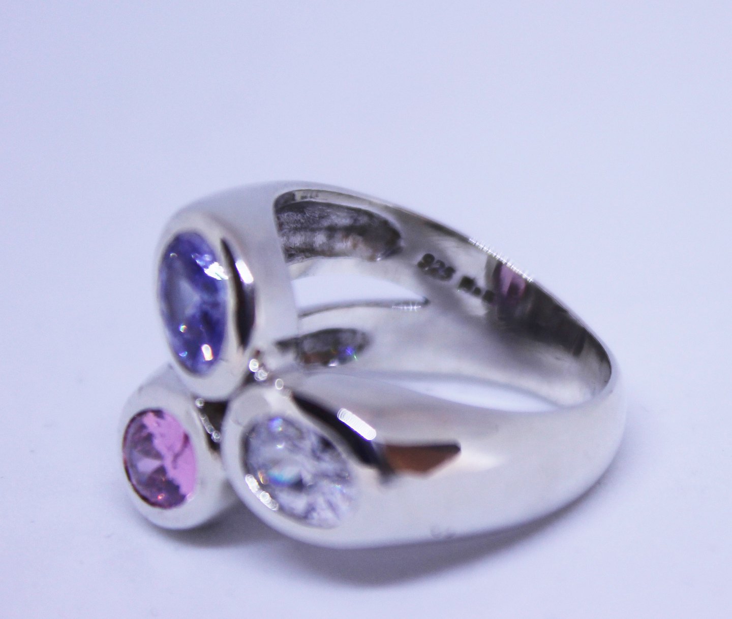 Stor ring af 925 sterling sølv med tre syntetiske sten i lyselilla farver, stemplet B&G.