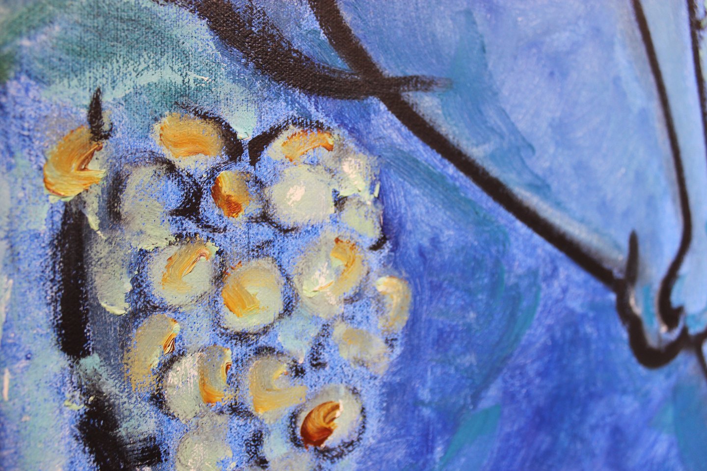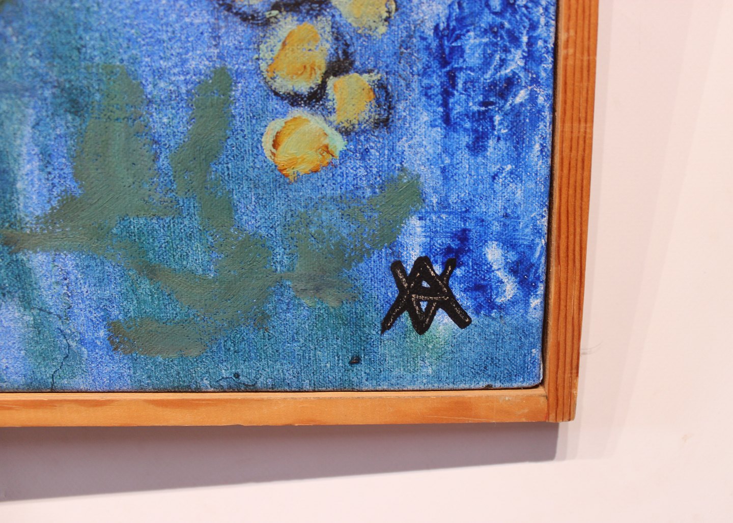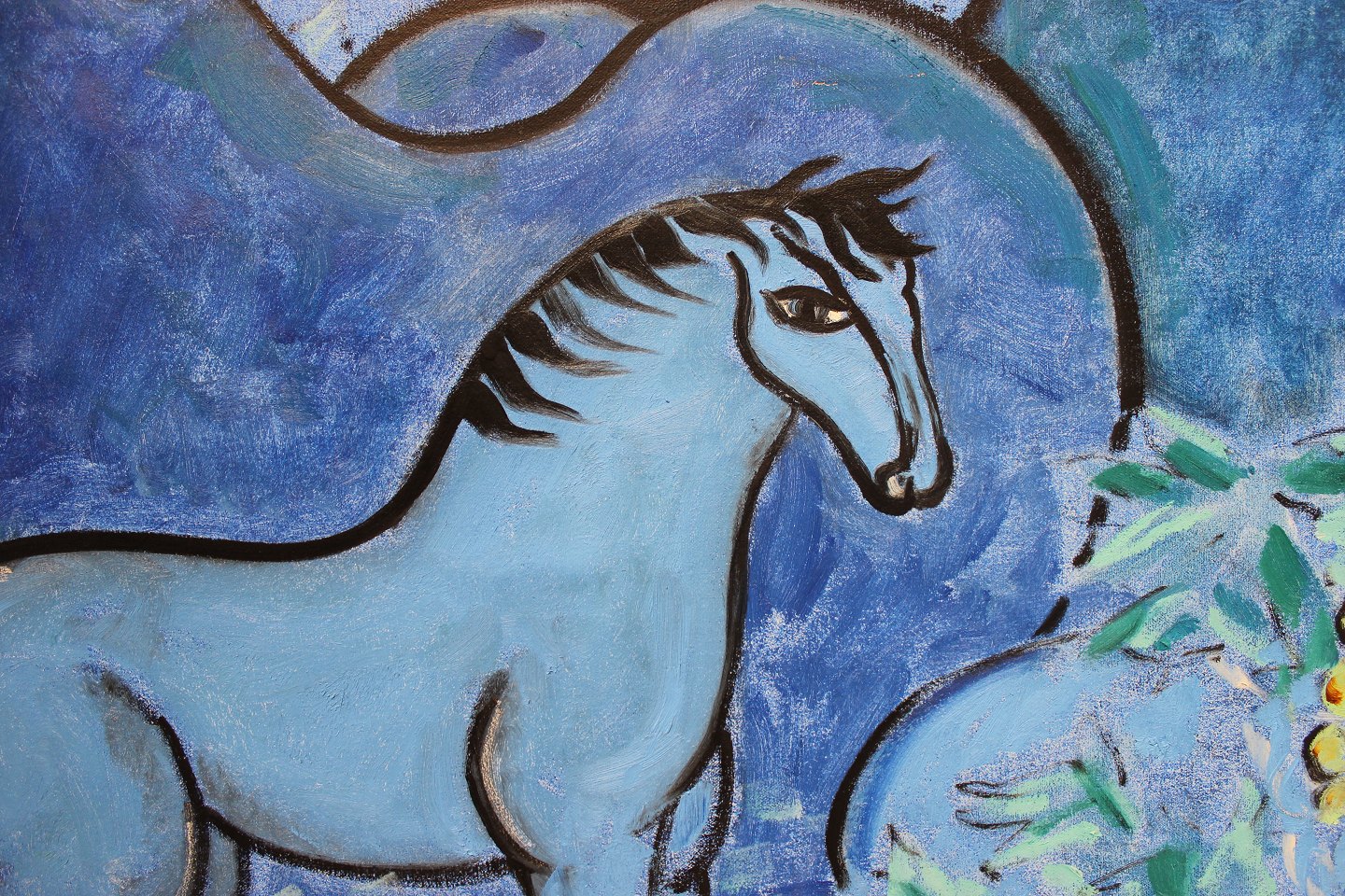 SolgtMaleri på lærred kaldet "Vin havens blå heste" af Vibeke Alfelt fra 1991. Maleriet er i flot brugt stand. Vibeke Alfelt er datter af de to danske kunstnere Else Alfelt og Carl-Henning Pedersen.