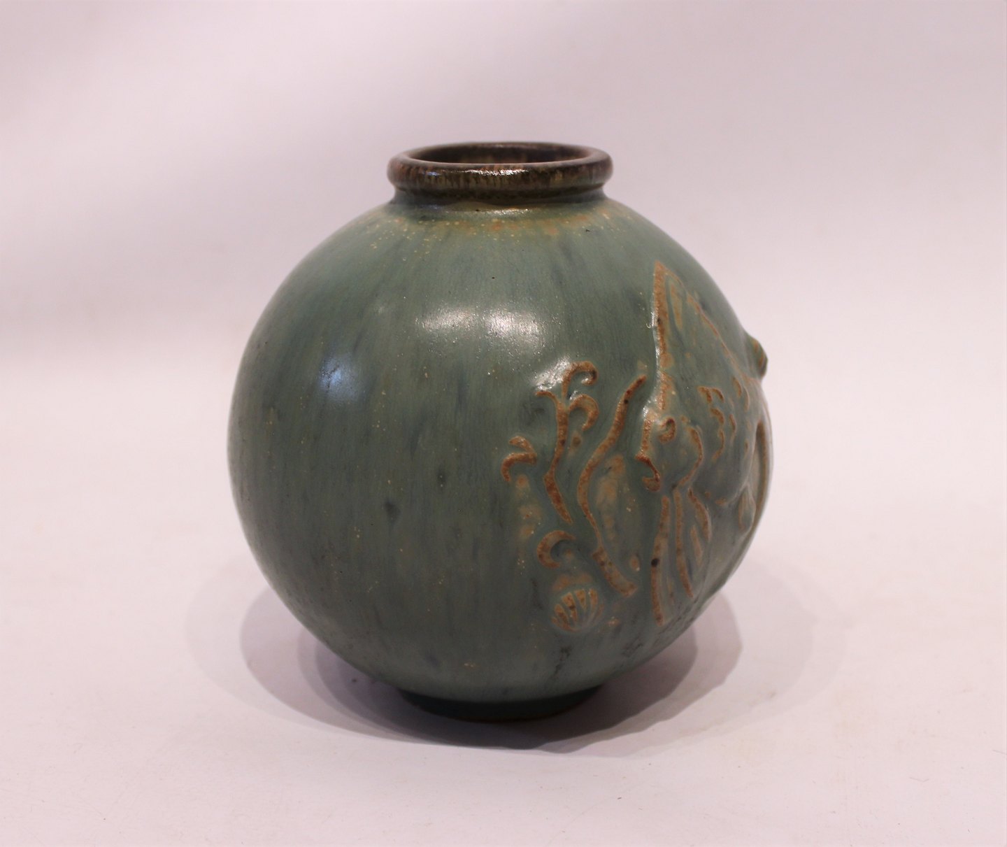 SolgtKeramik vase i turkise farver dekoreret med fiskemotiv, nr. 18, af Arne Bang. Vasen er i flot brugt stand.