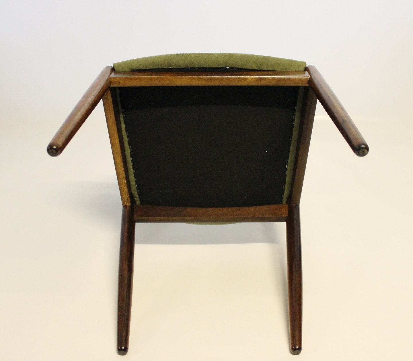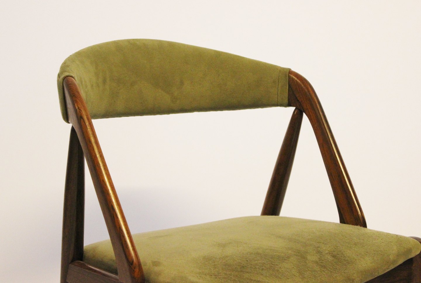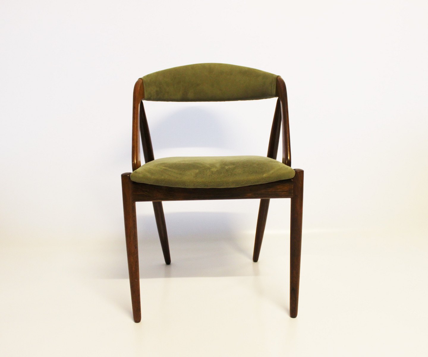 SoldA set of six dining chairs, model 31, designed by Kai Kristiansen and manufactured by Schou Andersen in the 1960s. The chairs are of rosewood and upholstered with green fabric.