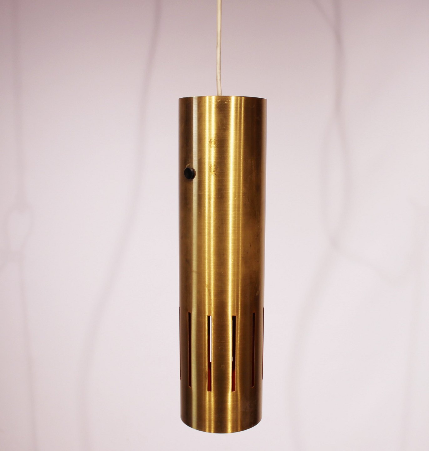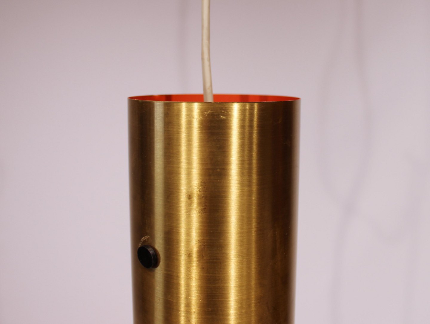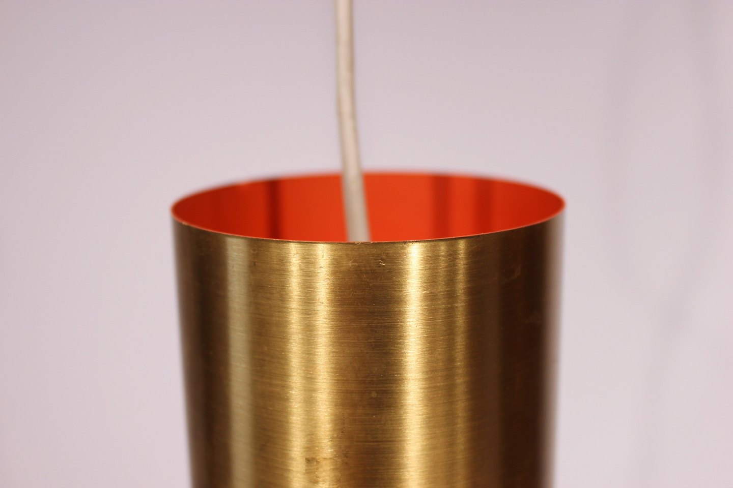 SolgtRetro loft pendel i messing og indvendig orange lakering af dansk design fra 1970erne. Lampen er i flot brugt stand.