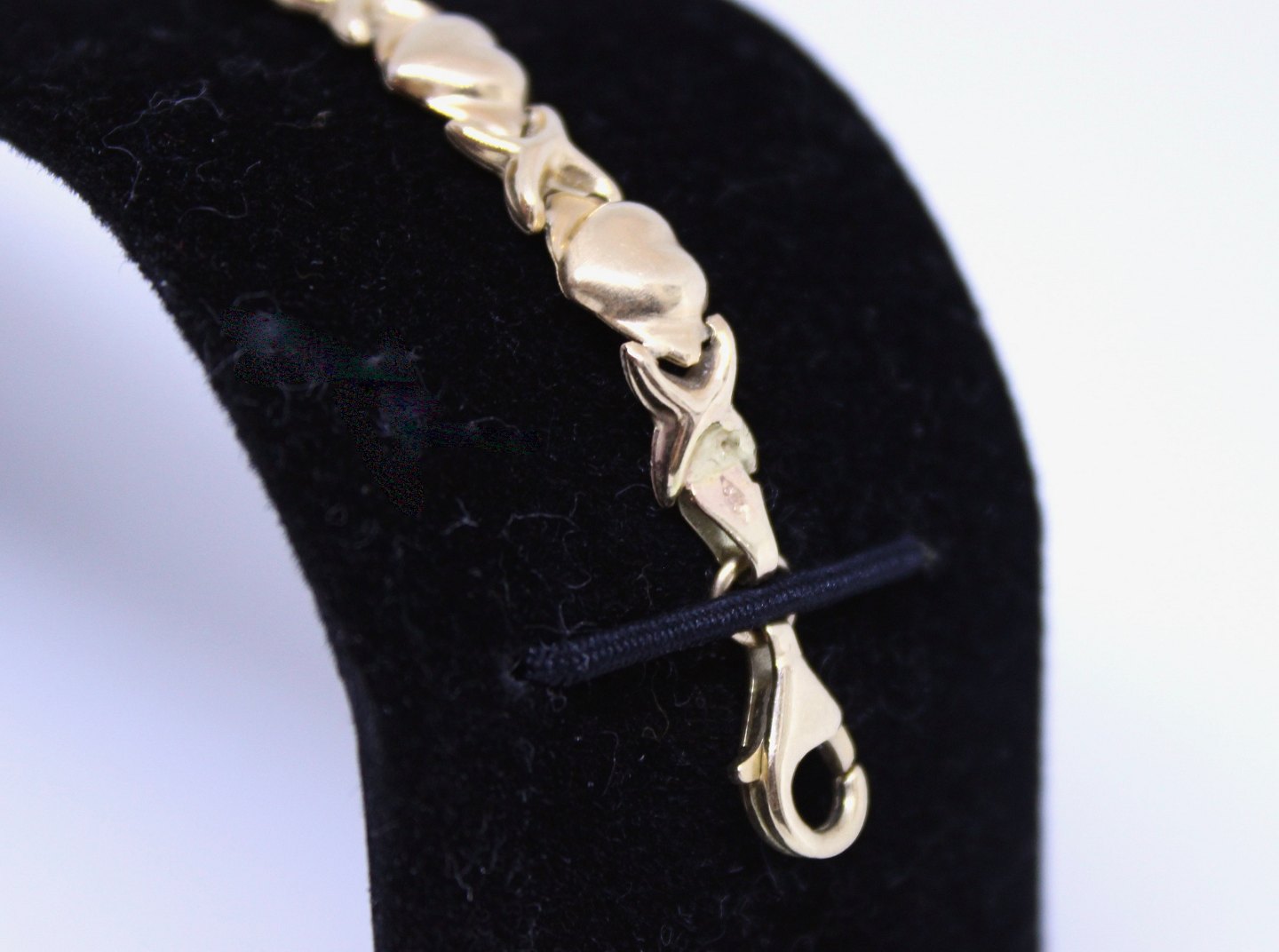 SolgtArmkæde af 14 karat guld dekoreret med hjerter og stemplet BEE.