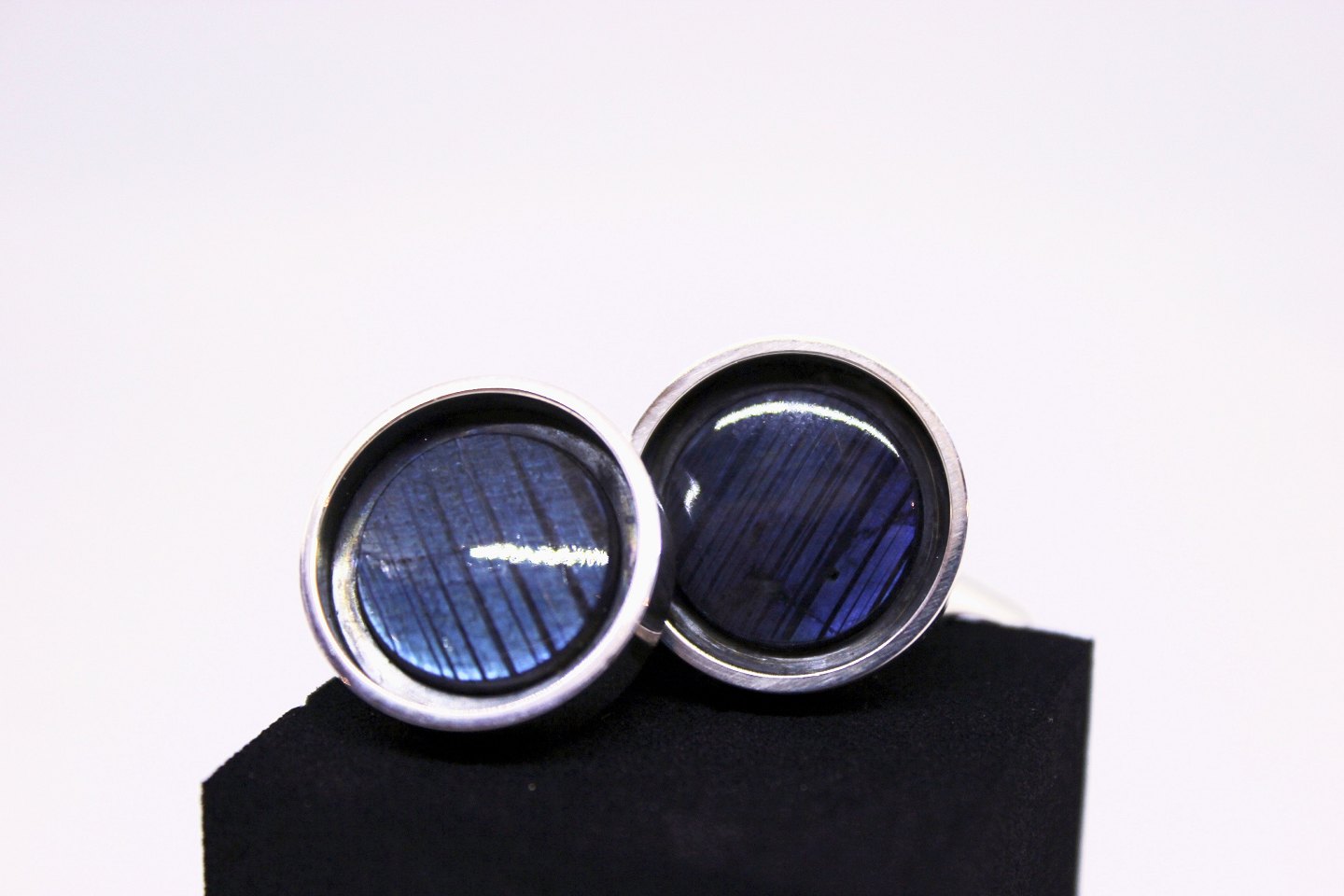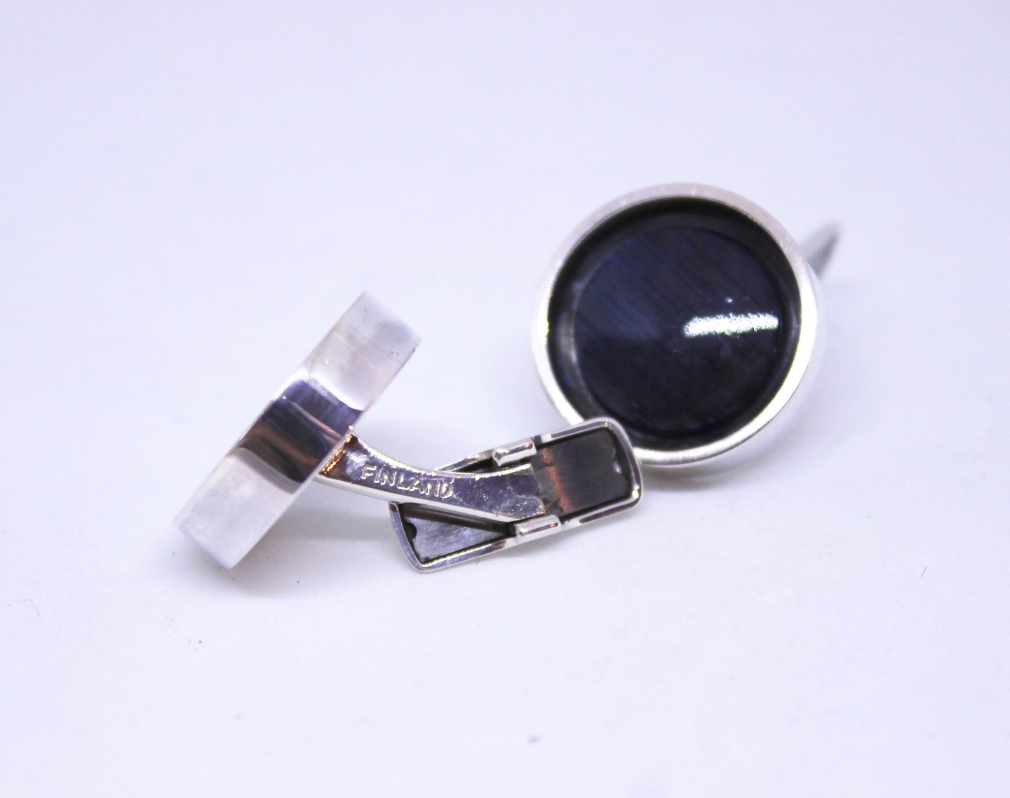 Et par manchetknapper af sølv, dekoreret med blå sten og fra Finland.
