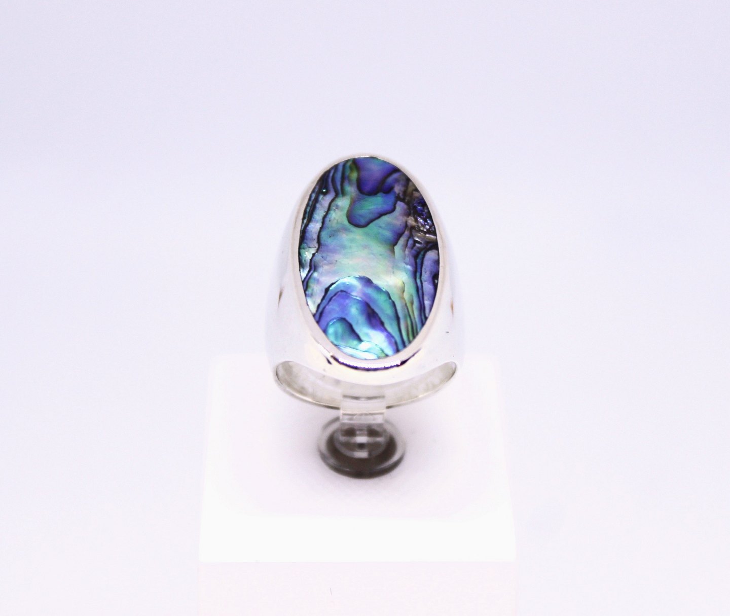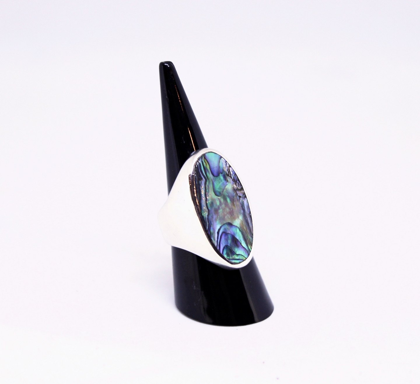SolgtRing dekoreret med farvet perlemor, stemplet ALE og af 925 sterling sølv. Ringen er i flot brugt stand.