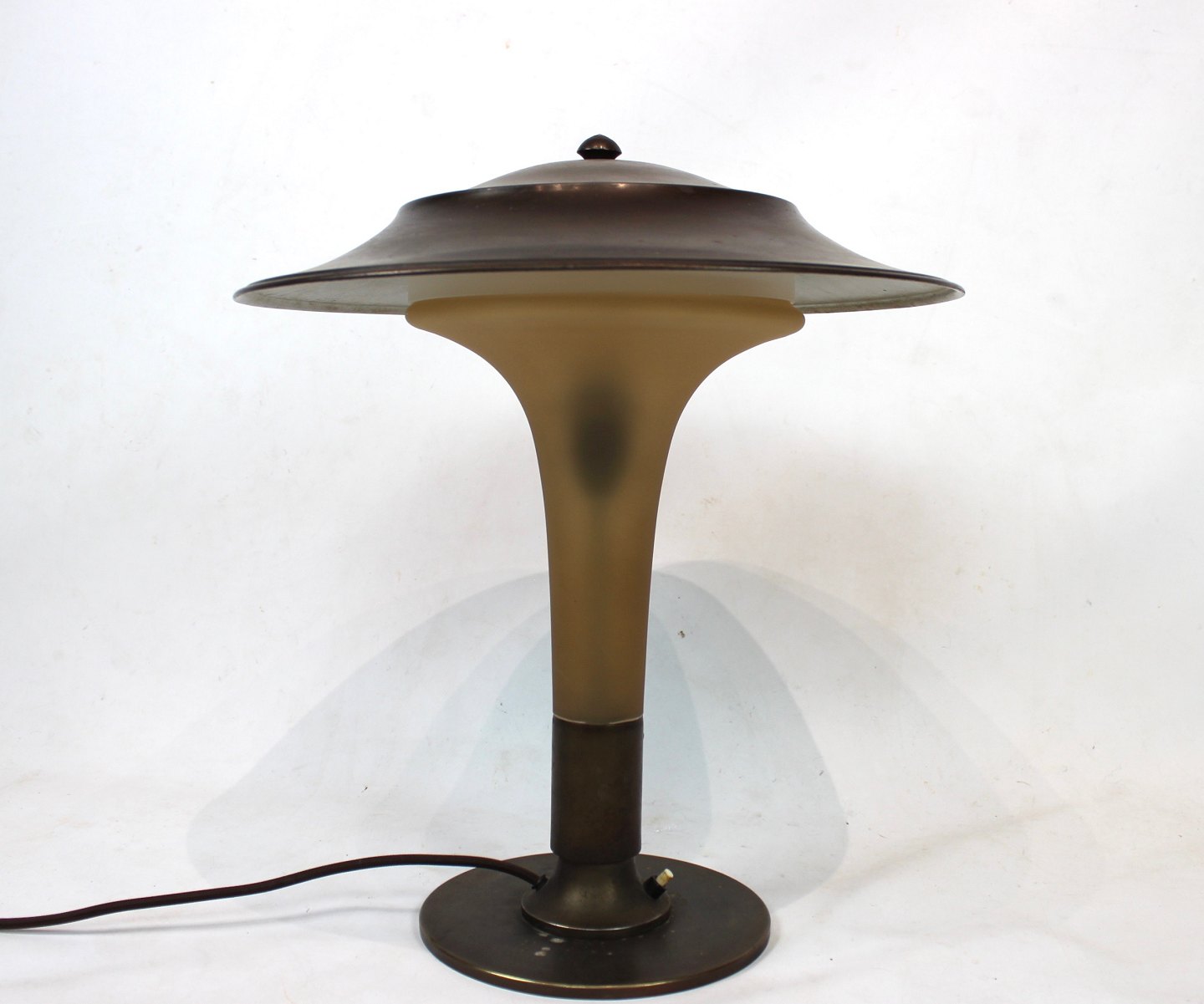 The Torch lamp with stem of amber colored glass and foot and shade of patinated brass, by Fog and Mørup from the 1930s.