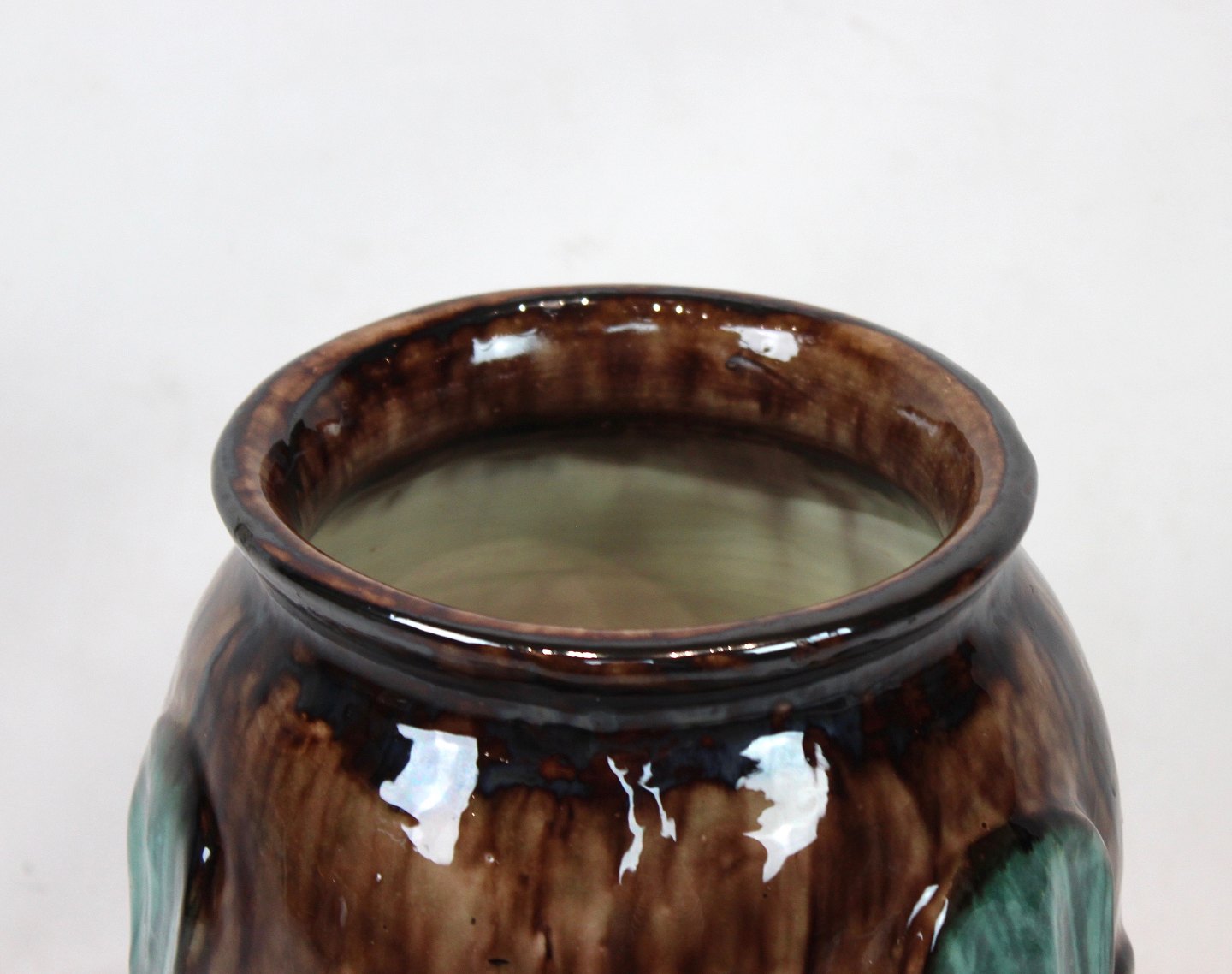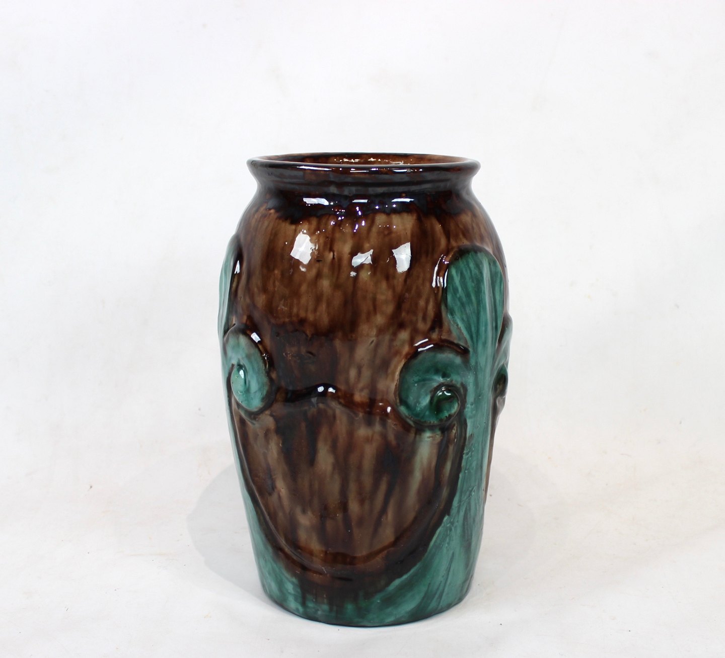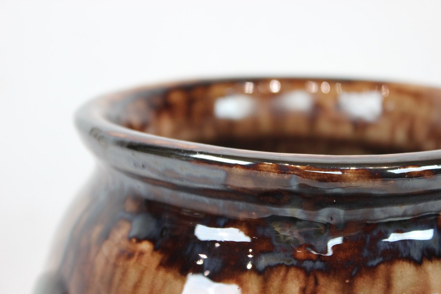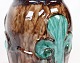 SolgtStor keramik vase med mørkebrun og turkis glasur, nummereret 112 og af modellen Fransk Lilje fra Roskilde Lervare fabrik. Vasen er i flot brugt stand.