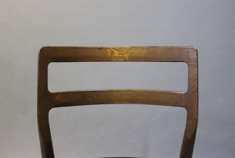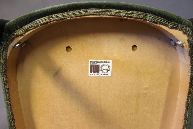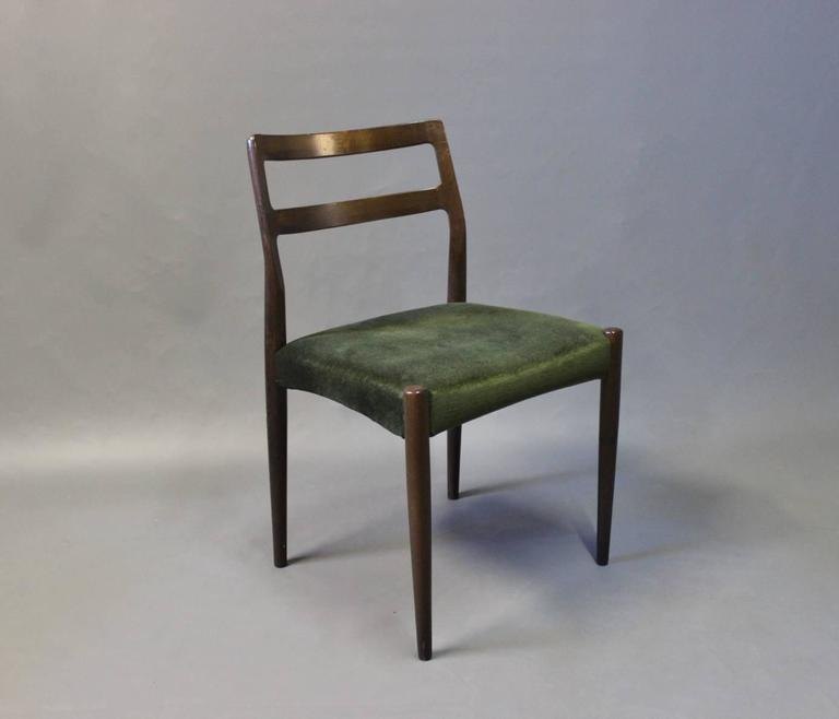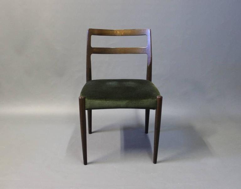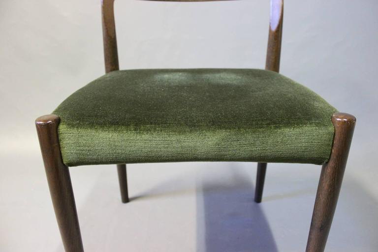 Et sæt af seks spisestuestole, model Anne, designet af Johannes Andersen og fremstillet af Uldum Møbelfabrik i 1960erne. Stolene er af poleret eg og med sæder af grønt stof.