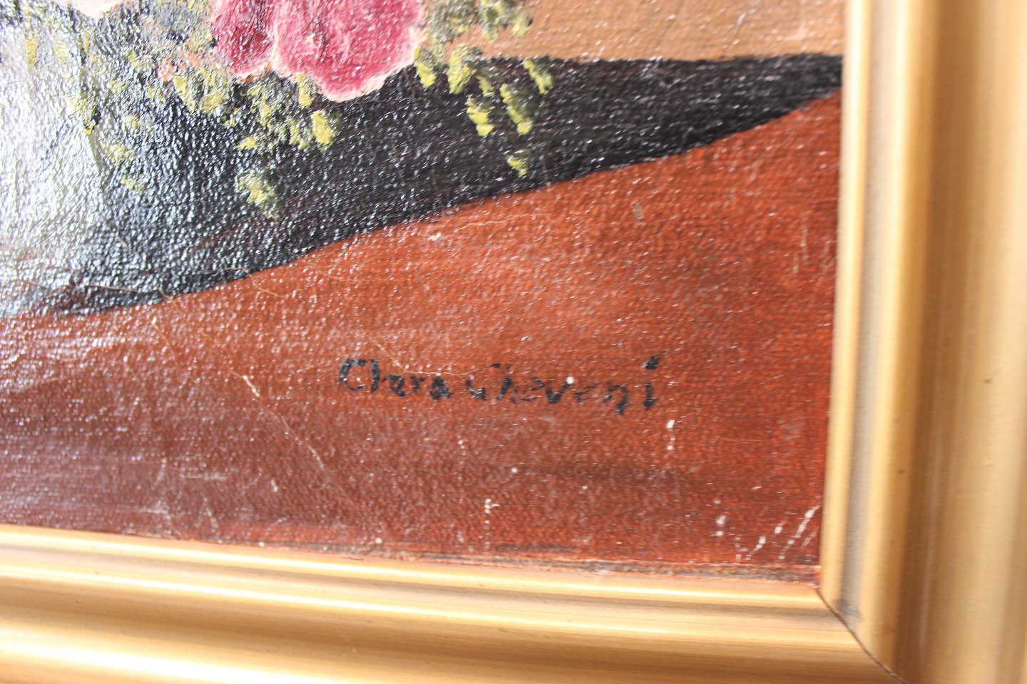 Painting with floral motif and gilded frame signed Clara Cleveni. The painting is in great condition.