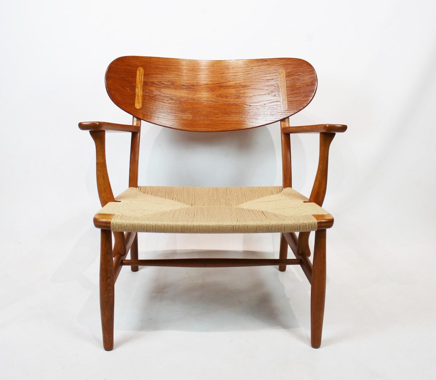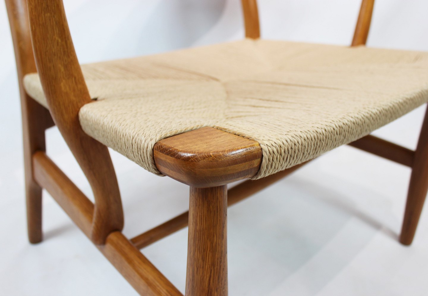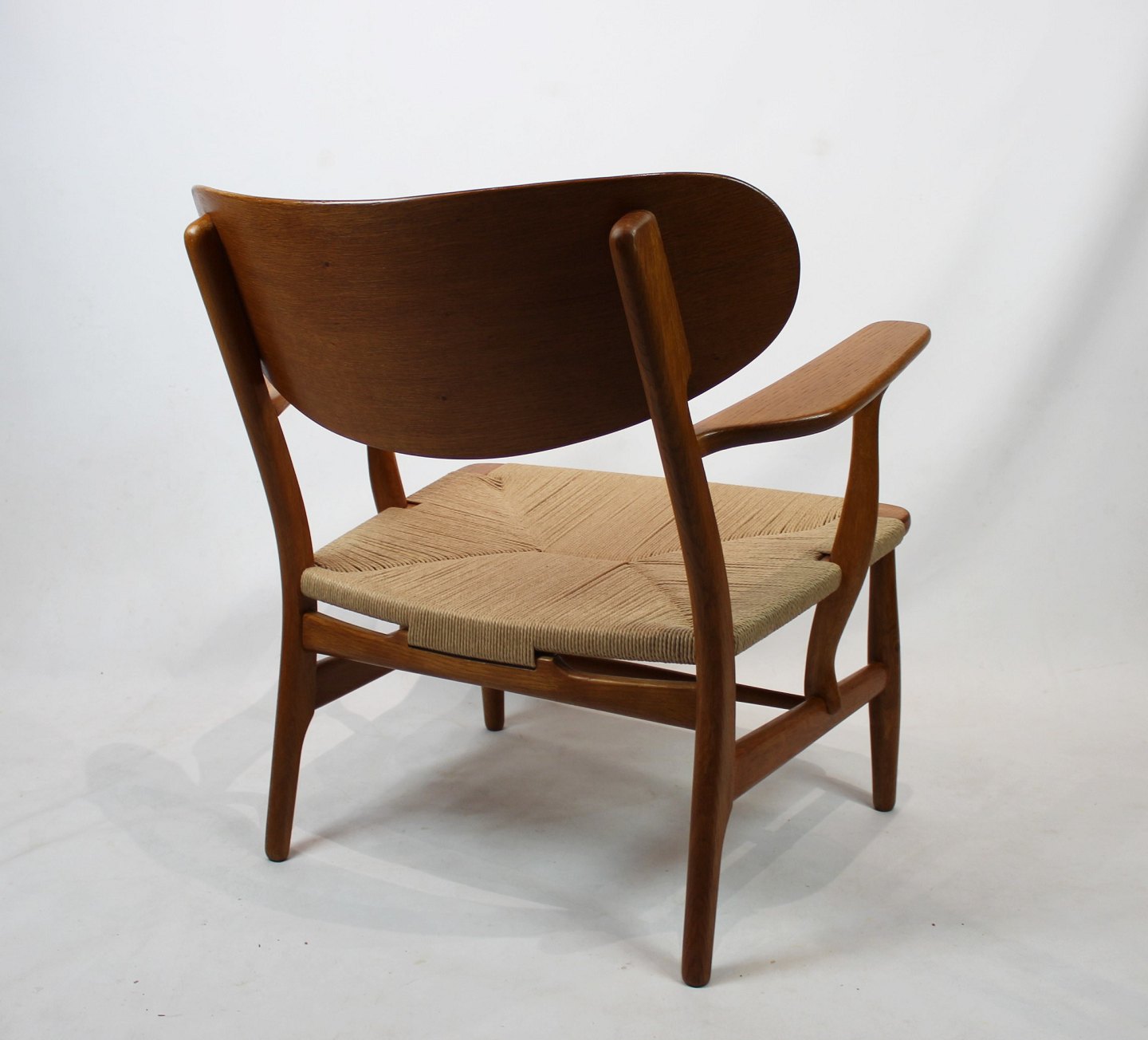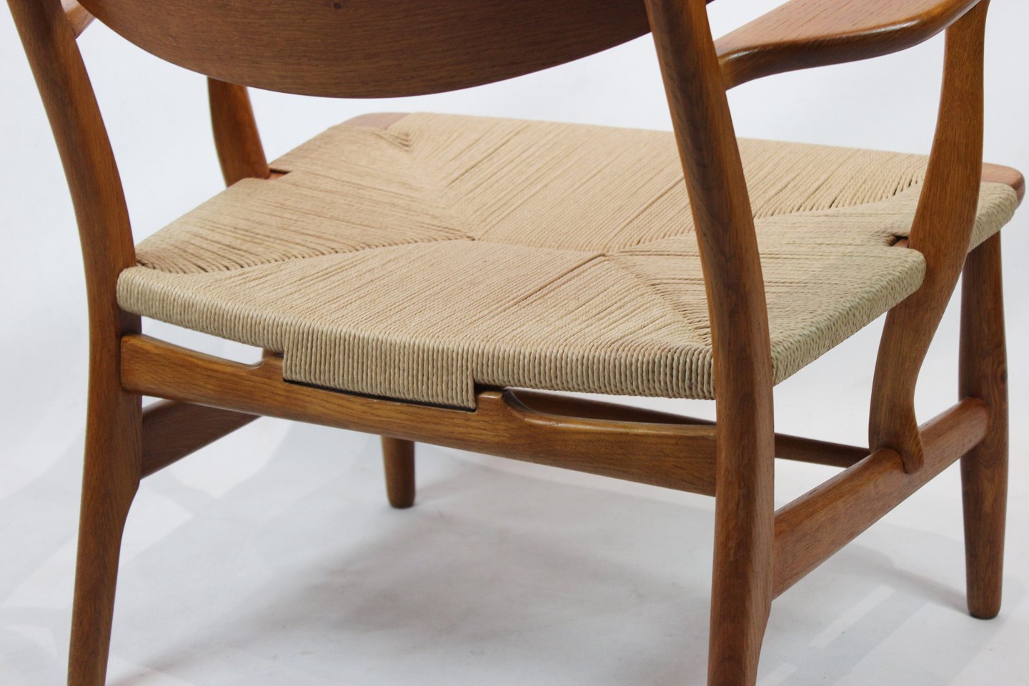 Armstol, model CH22, i egetræ og papirflet designet af Hans J. Wegner og fremstillet af Carl Hansen & Søn i 1950erne. Stolen er i flot original stand med ny flet.