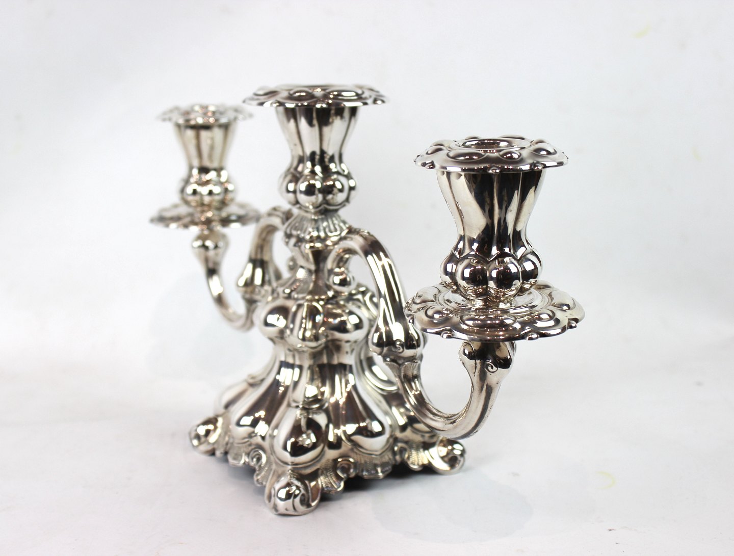 SolgtEt sæt af toarmede lysestager af tretårnet sølv.