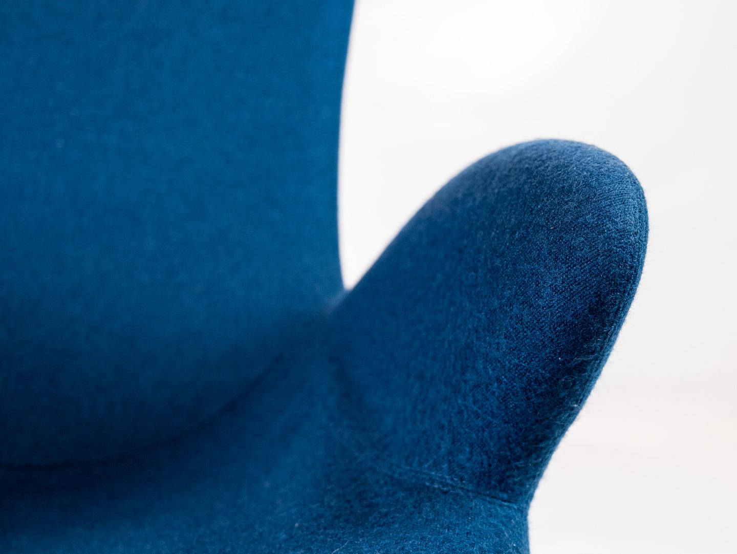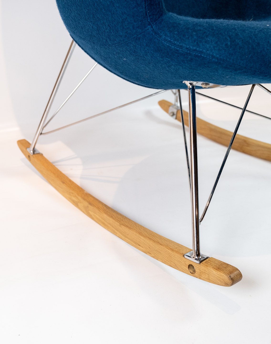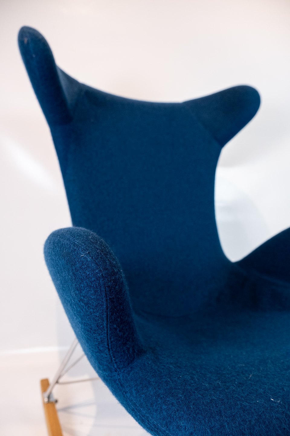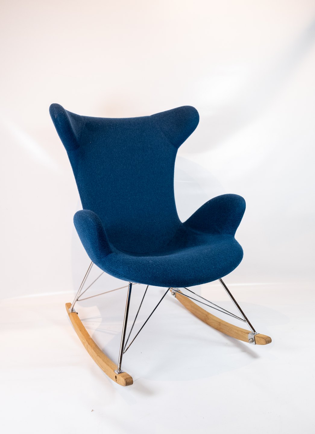 SolgtGyngestolen i mørkeblåt stof er et charmerende eksempel på dansk møbeldesign fra 1980'erne. Designet er præget af enkelhed og funktionalitet og har et tidløst udtryk, der passer perfekt til både moderne og klassiske indretningsstile.