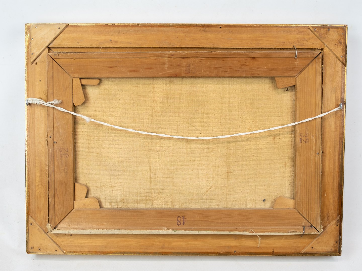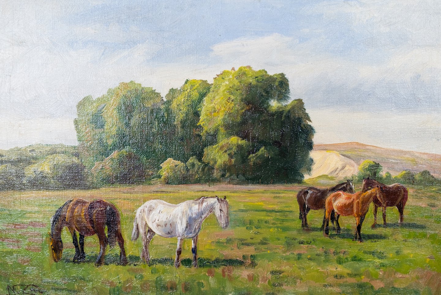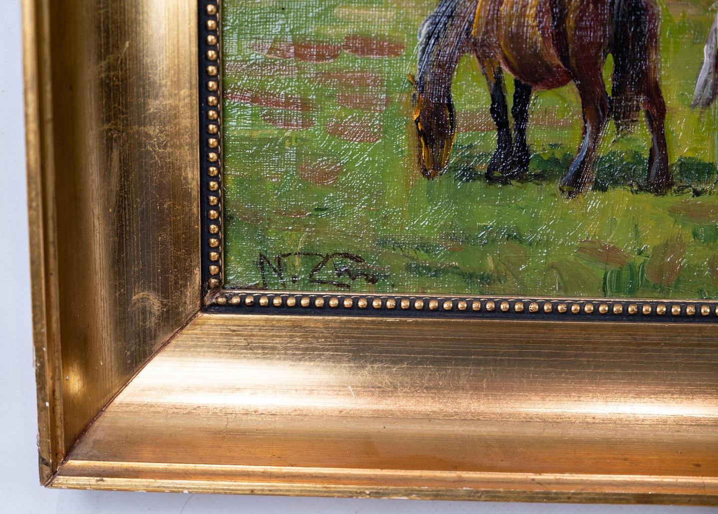 Oil painting with horse motif and gilded frame by Niels Christiansen (1873-1960).