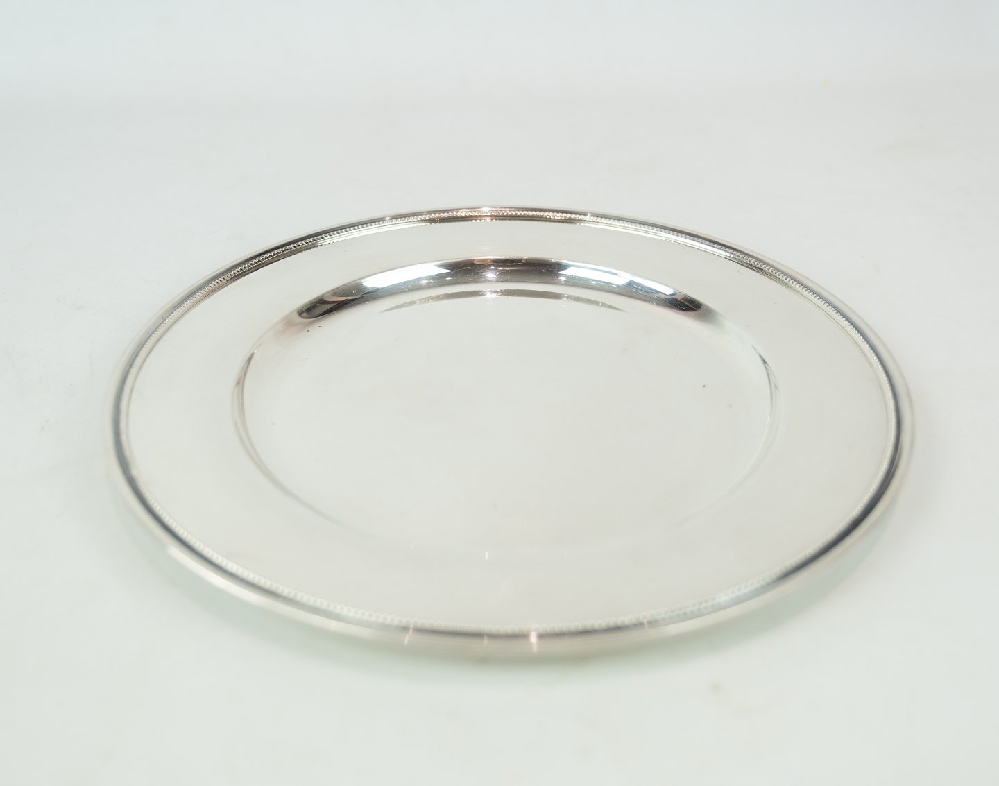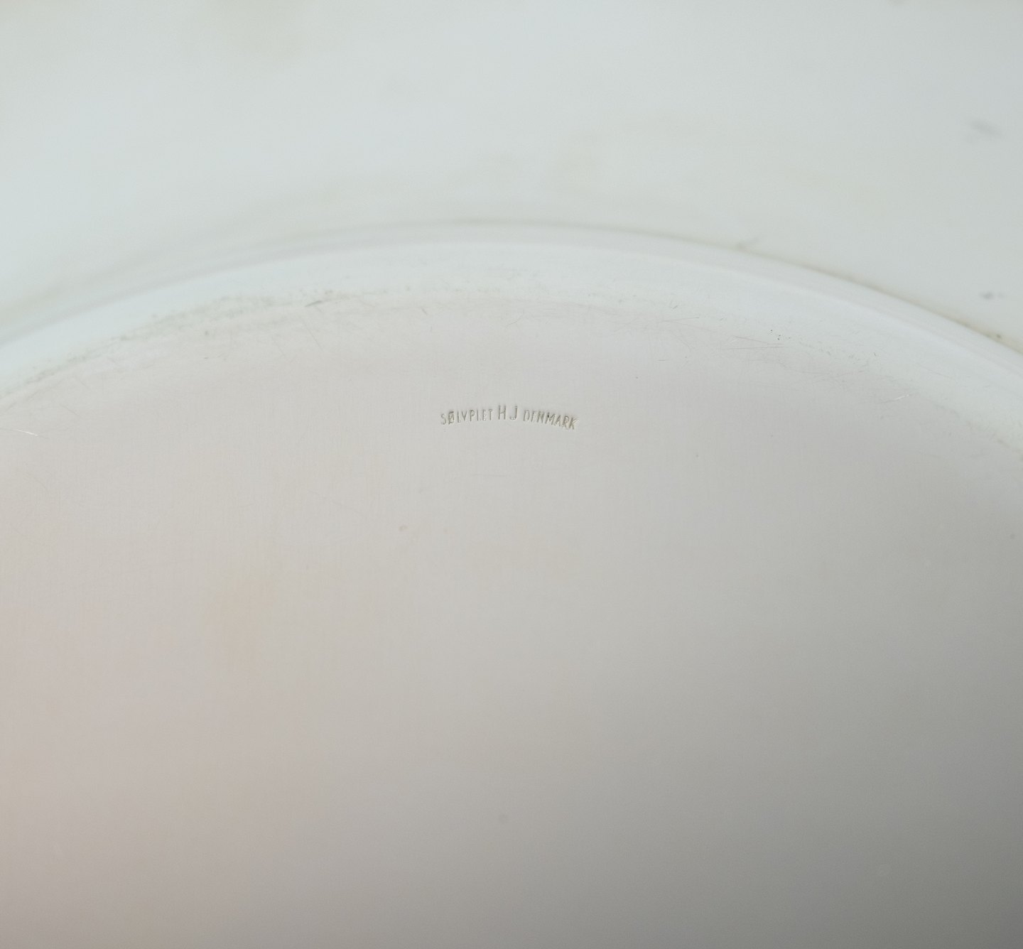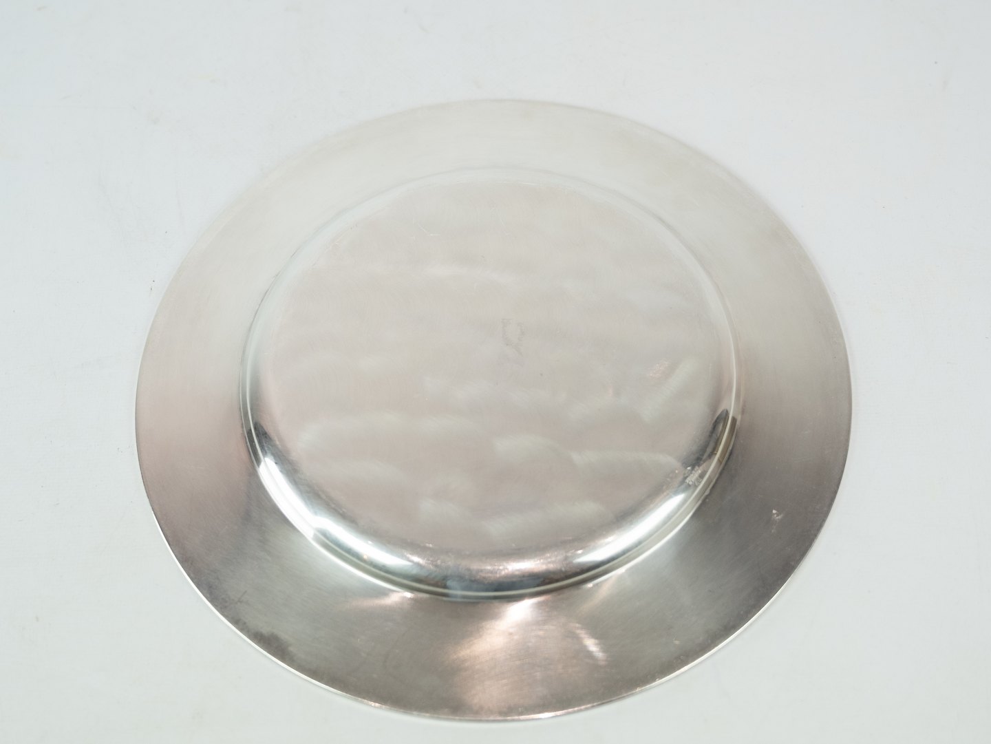 Dækketallerkner af sølvplet fra 1930erne. Vi har 12 stk. på lager.