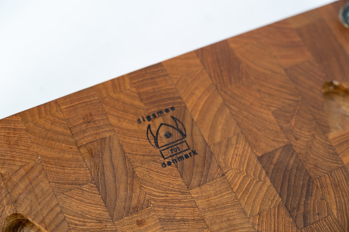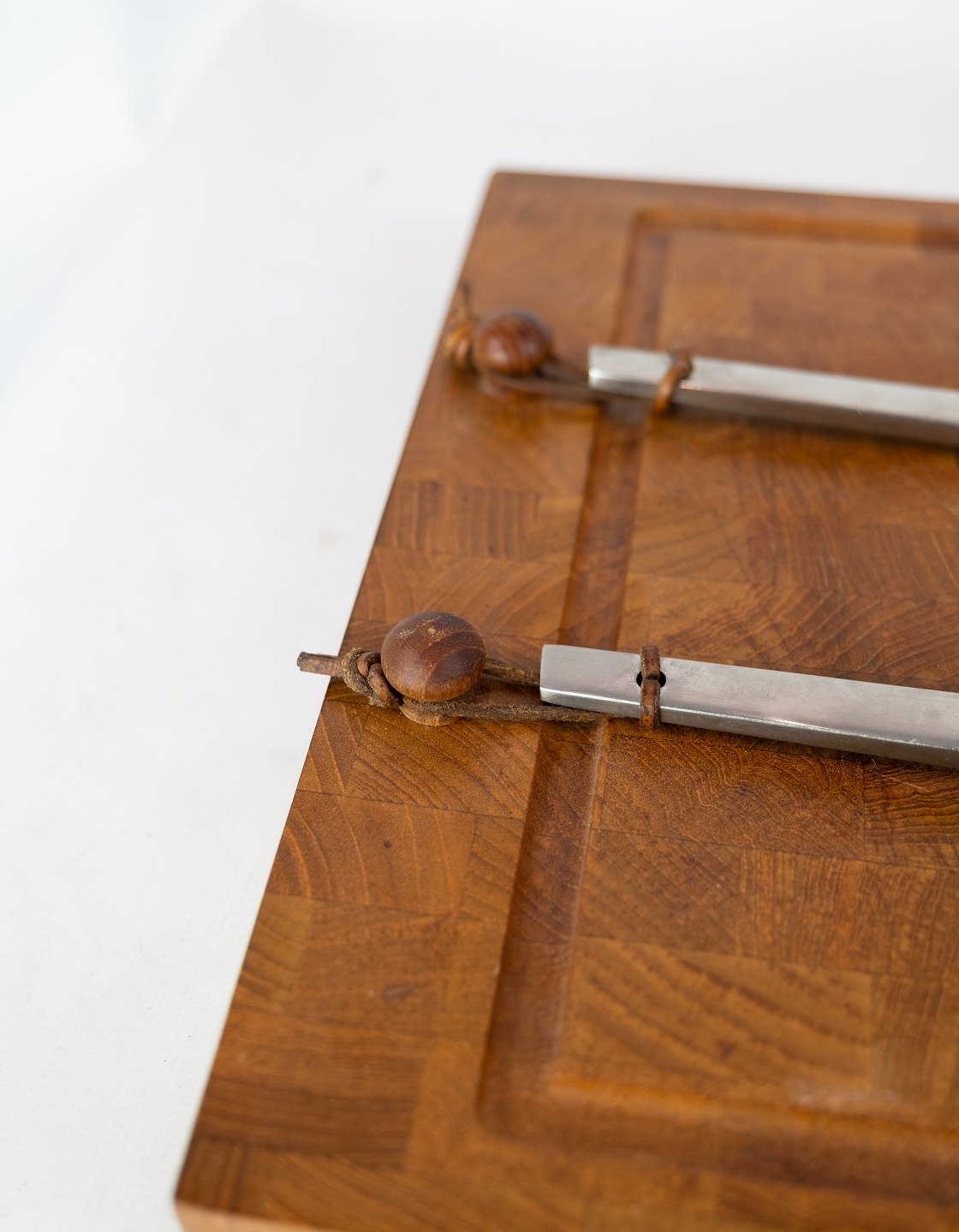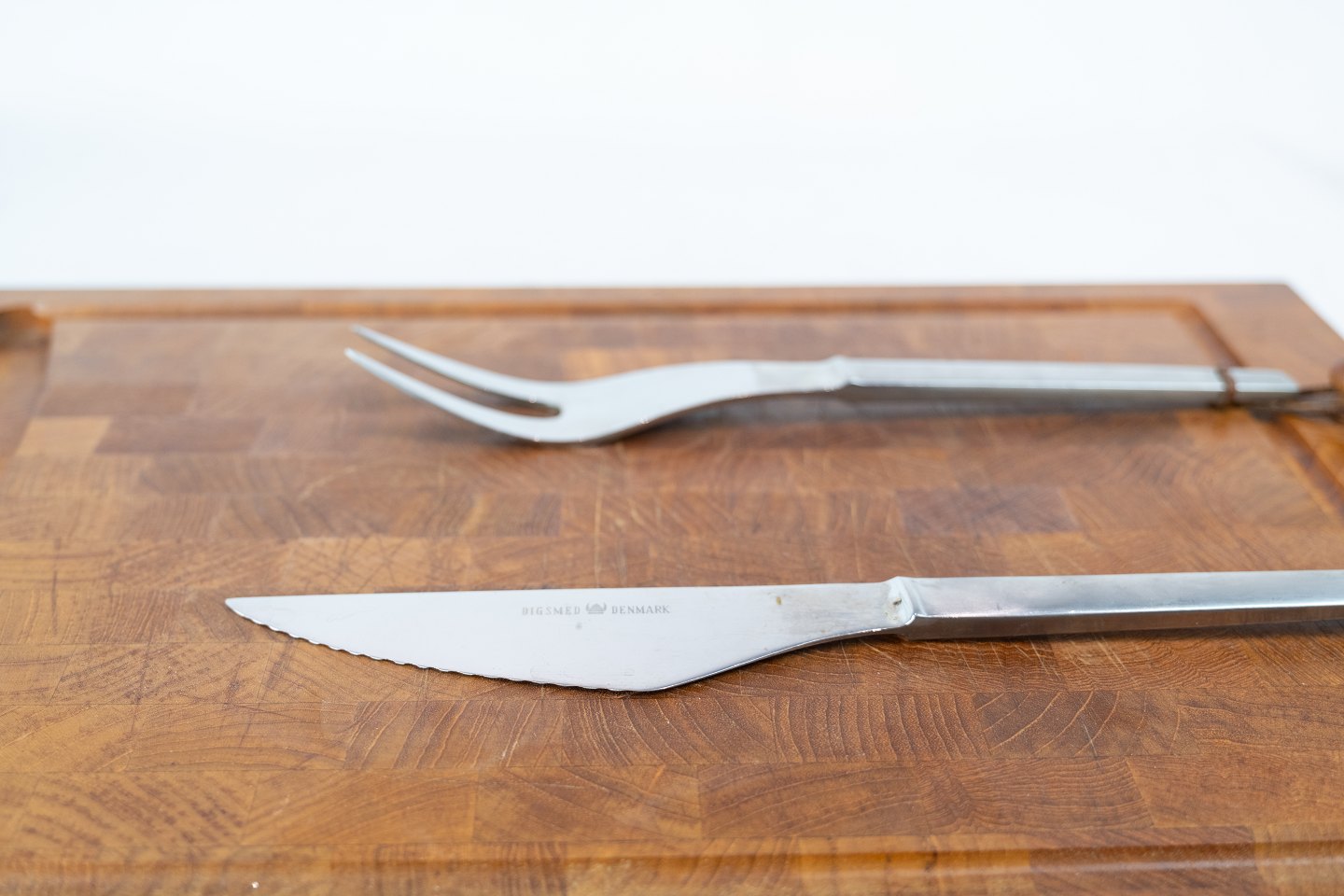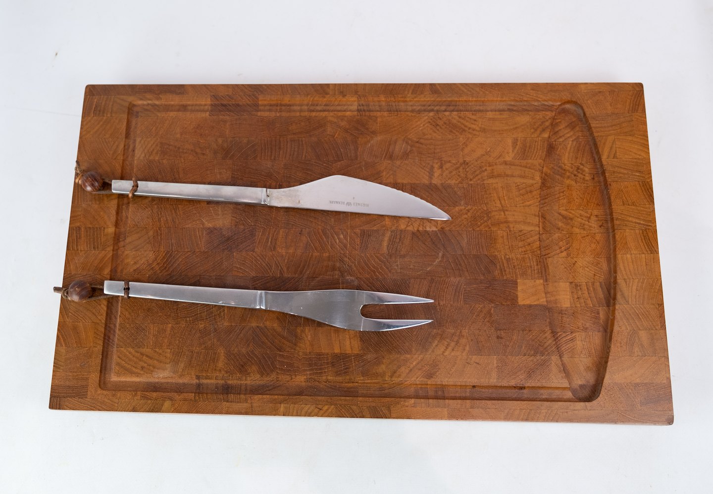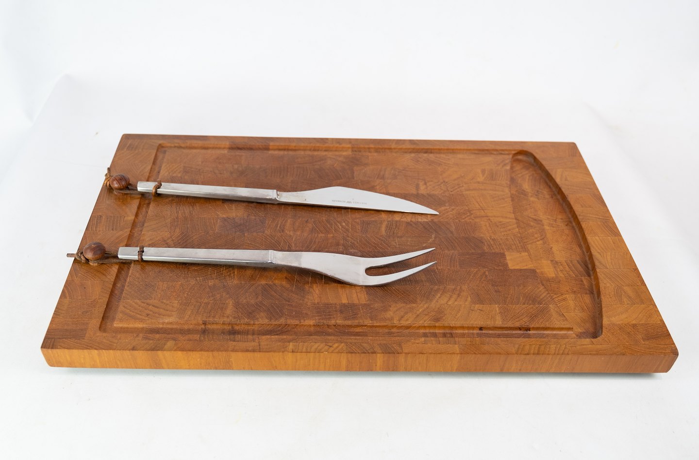 Skærebræt i teak og tilhørende forskærersæt i stål af Digsmed, Denmark.