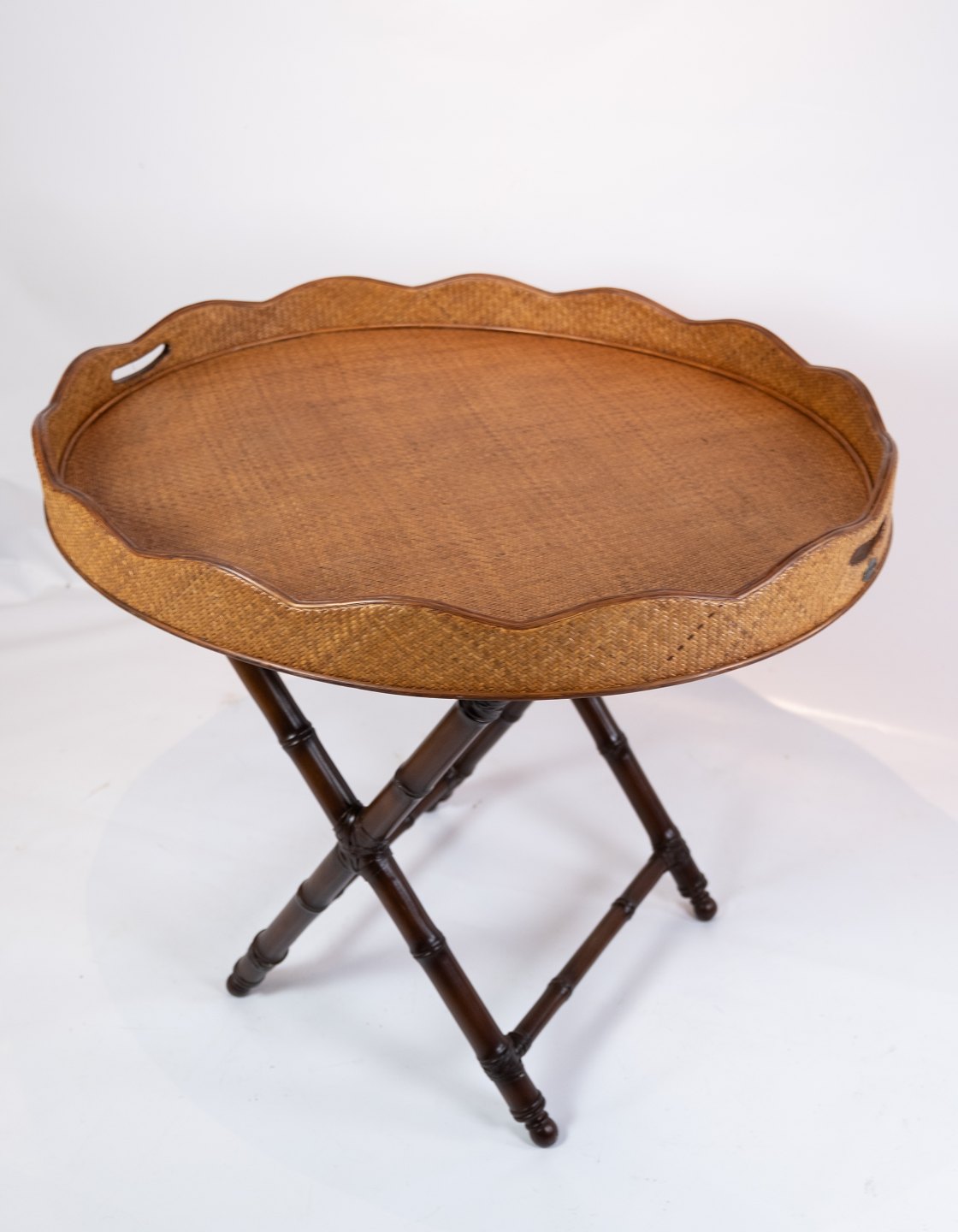 Tray table in polished Wood and cord from the 1970s.The tray can be removed and the legs can be folded together.