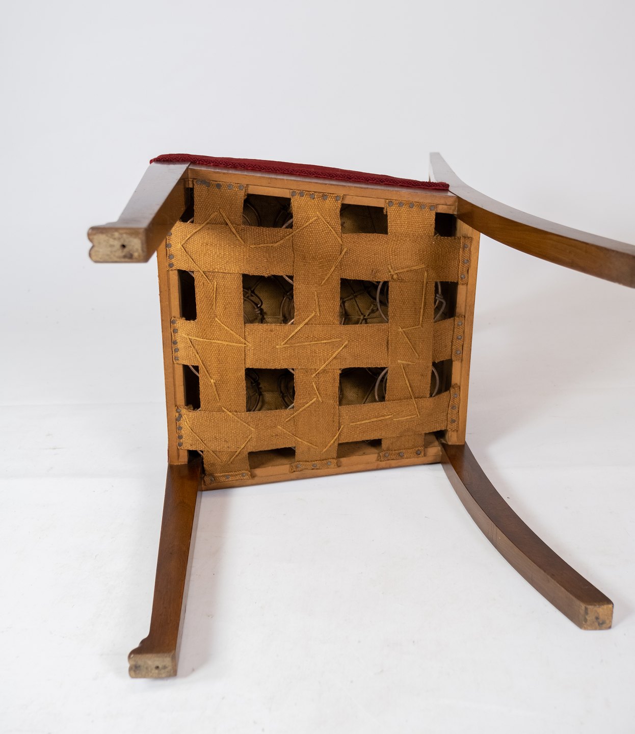 Set of four dining room chairs of walnut with inlaid wood and upholstered with red velvet from around 1910. The chairs are in great vintage condition.