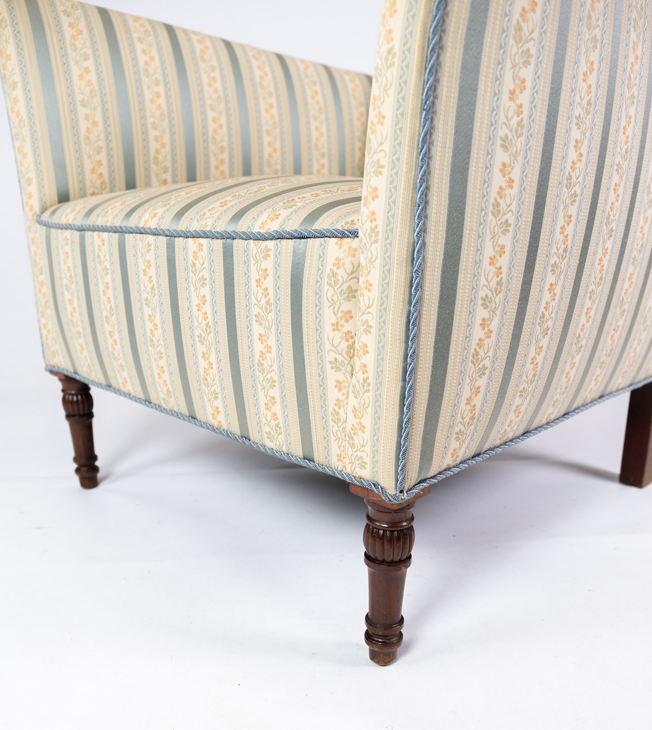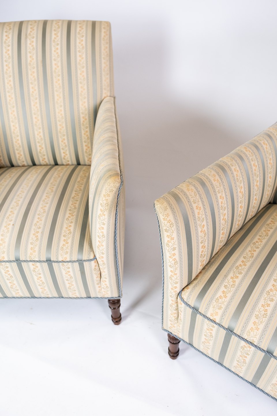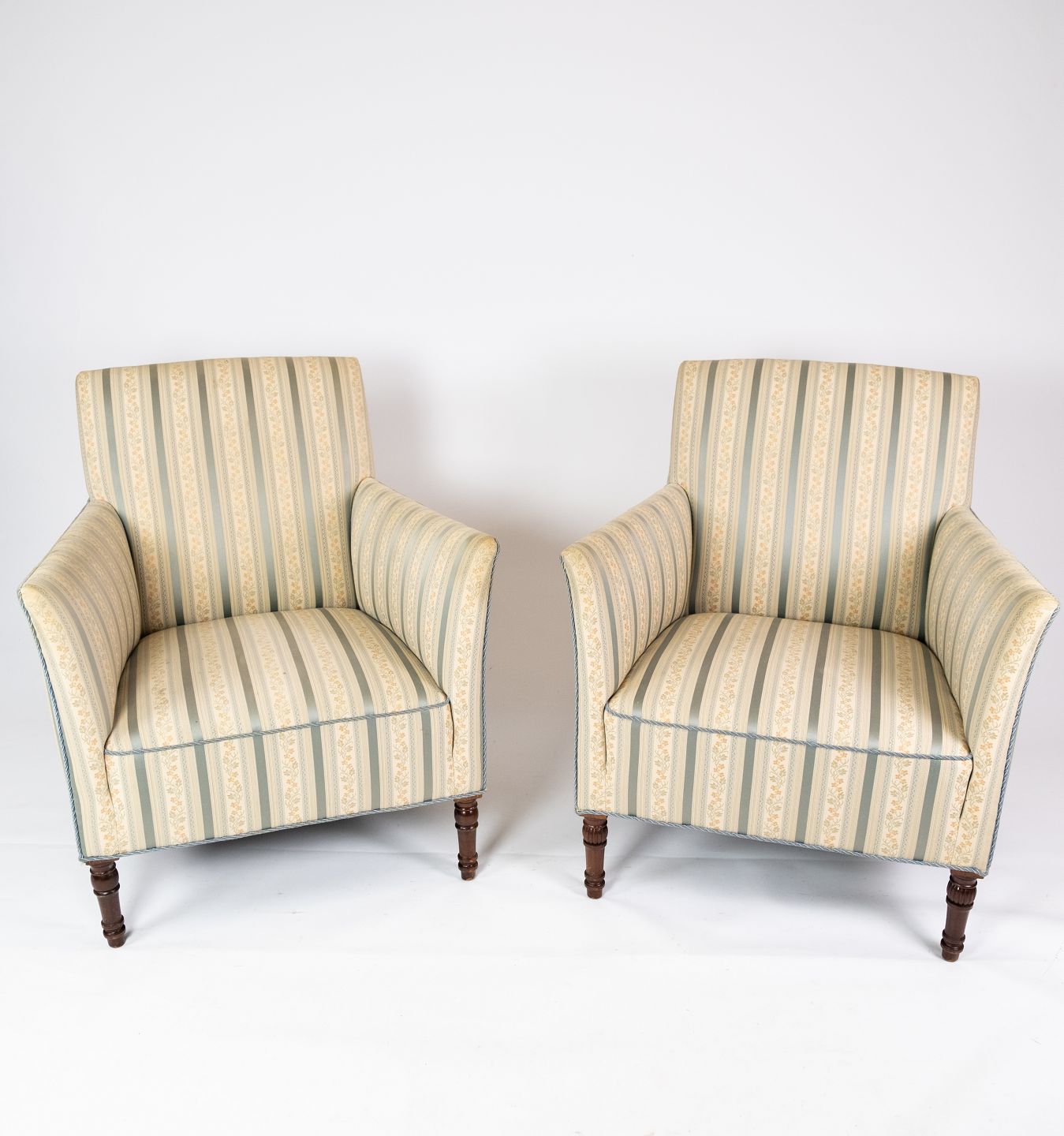 SolgtEt sæt hvilestole polstret med stribet stof og ben af mahogni, fra 1920erne. Stolene er i flot brugt stand.
