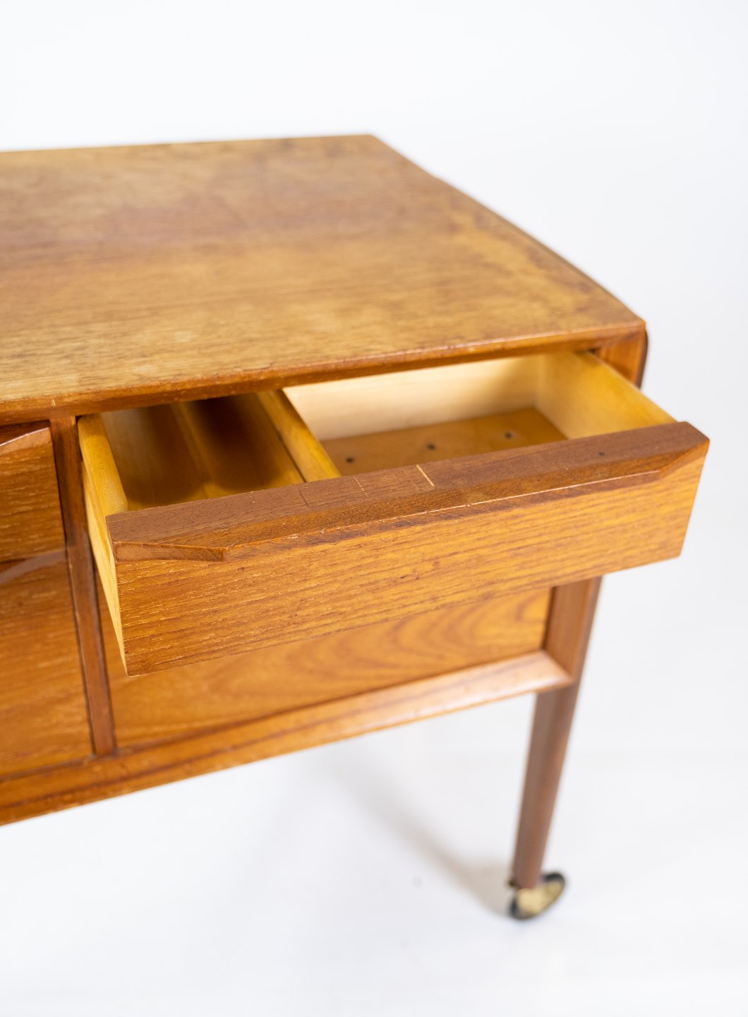 SolgtSidebord med skuffer og på hjul i teak af dansk design fra 1960erne. Bordet er i flot brugt stand.