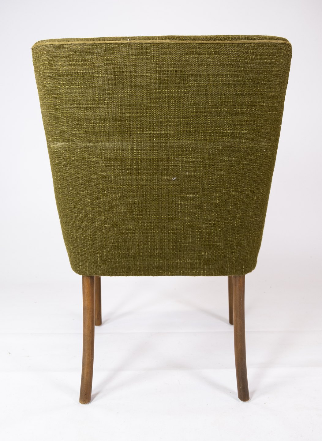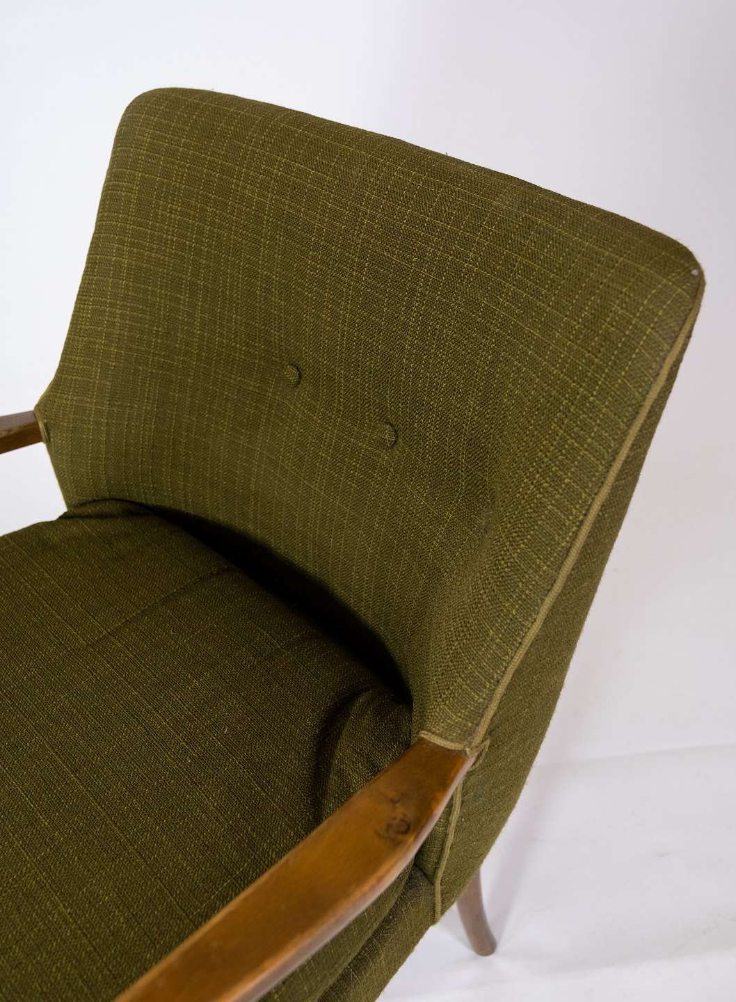 En armstol i birketræ med originalt mørkegrønt stof, af dansk design fra 1950'erne, fremviser en tidløs elegance og enkelhed, der karakteriserer den skandinaviske designtradition fra denne æra.