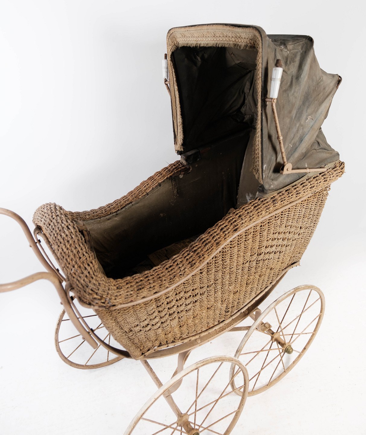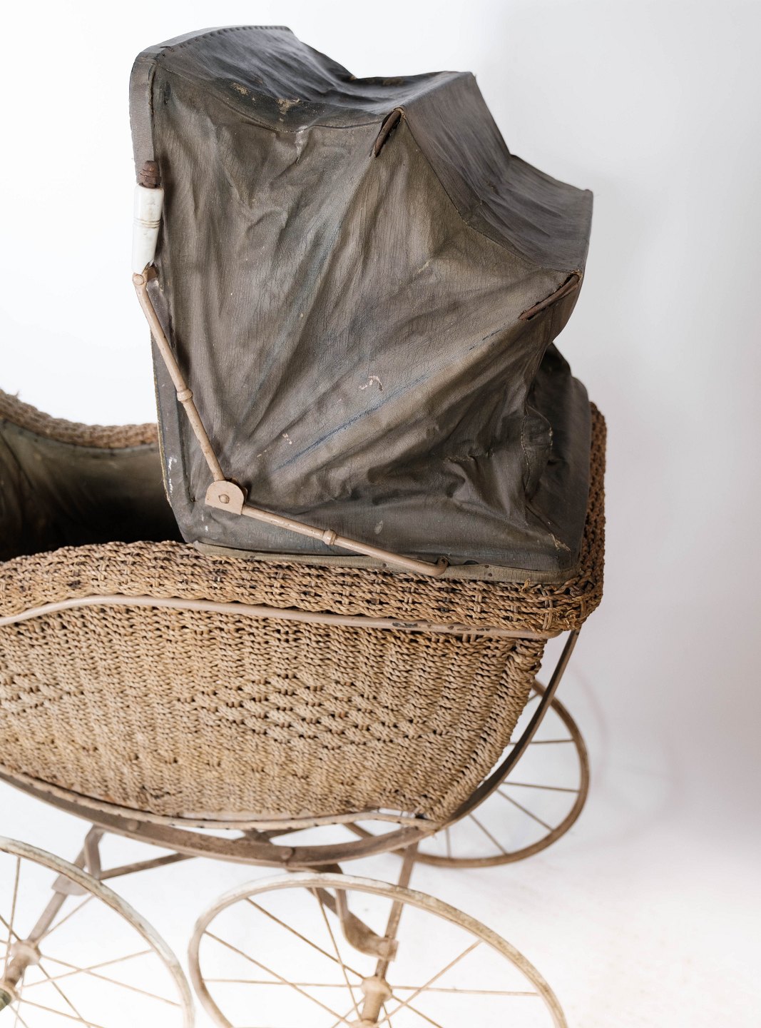 Antique child carriage of paper cord and metal wheels, from around the 1930s.