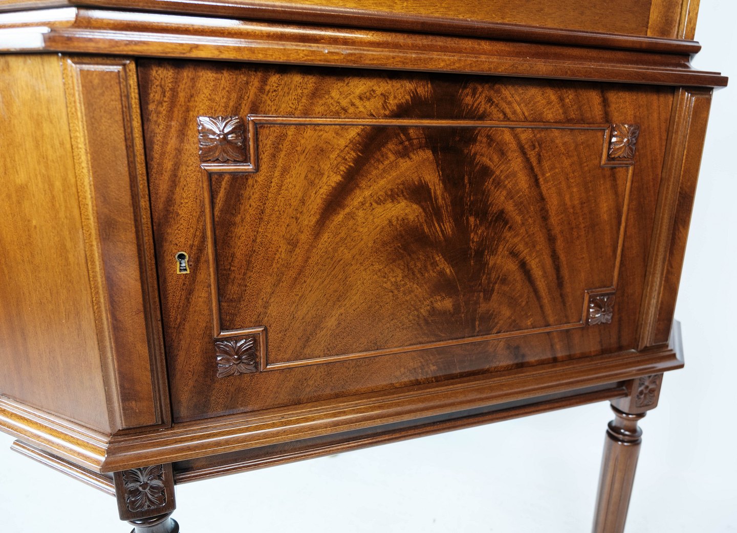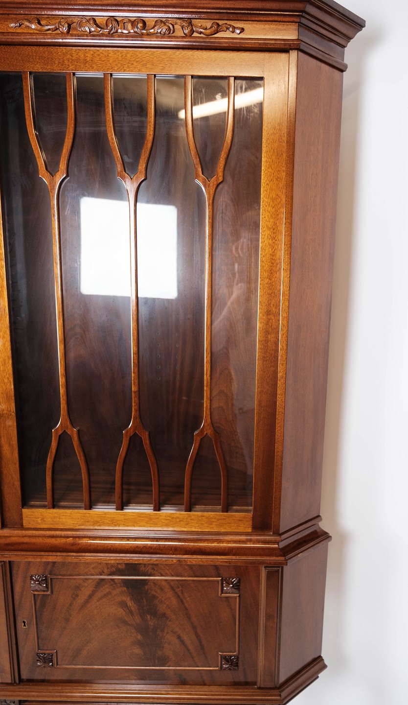 Hepplewhite hjørneskab af mahogni og glas med sprosser, i flot antik stand fra 1920erne.