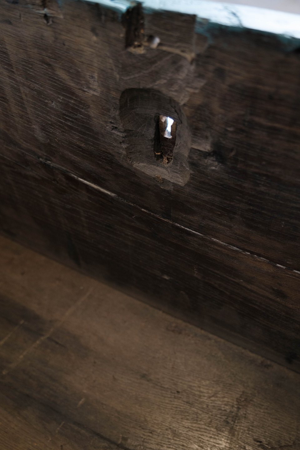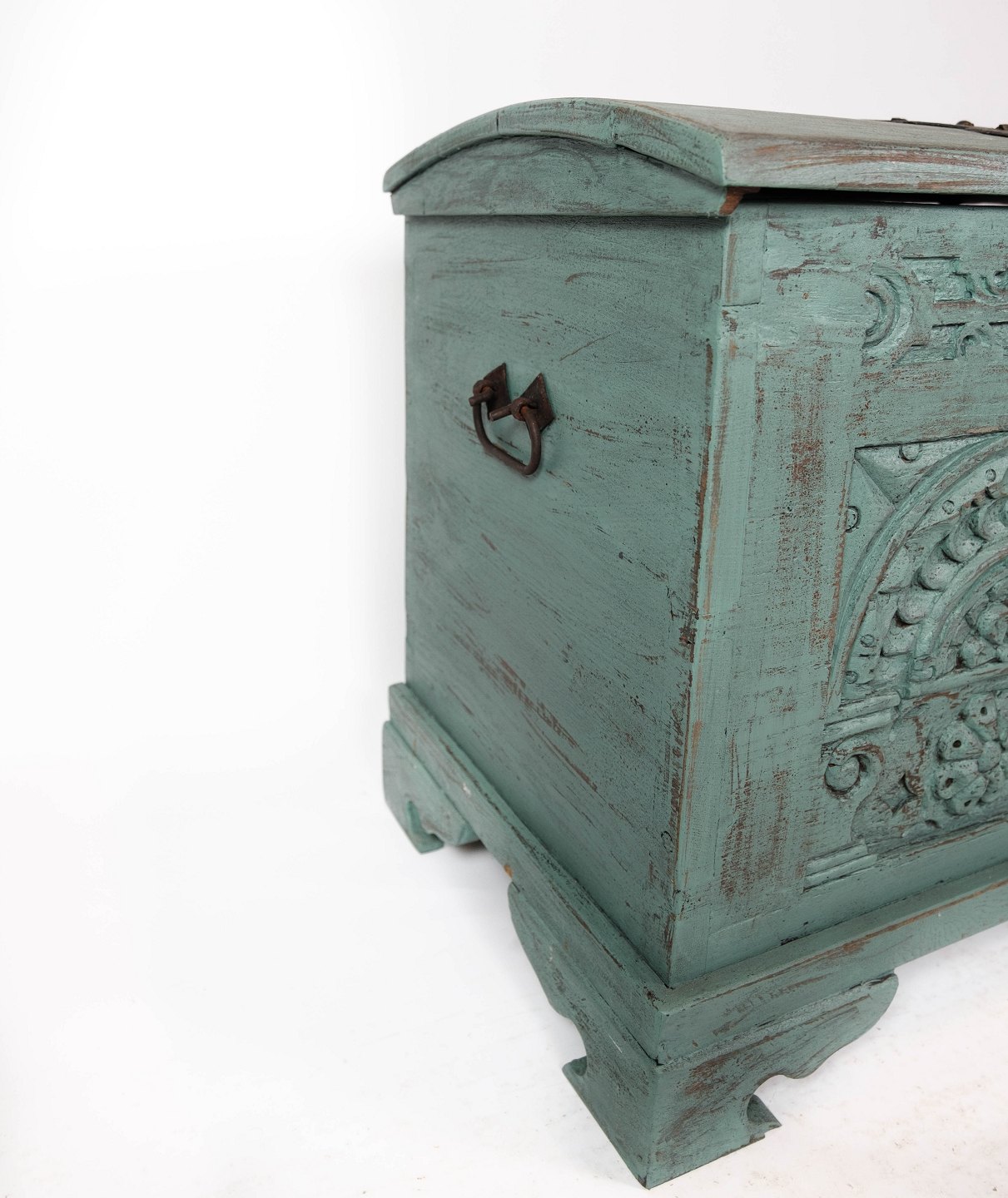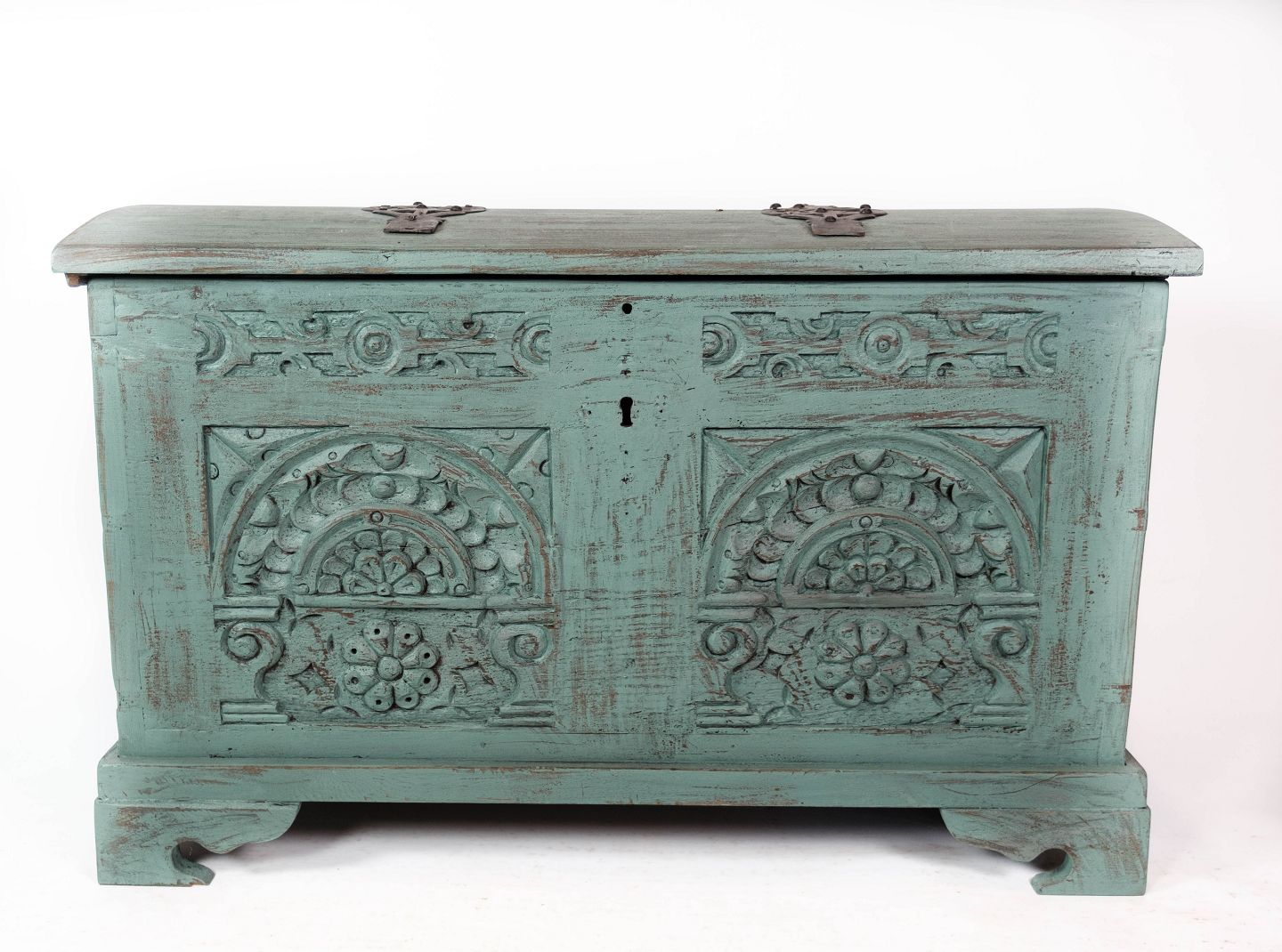 SolgtAntik kiste med udskæringer og original turkis bemaling. Kisten er i flot brugt stand og fra omkring år 1740.