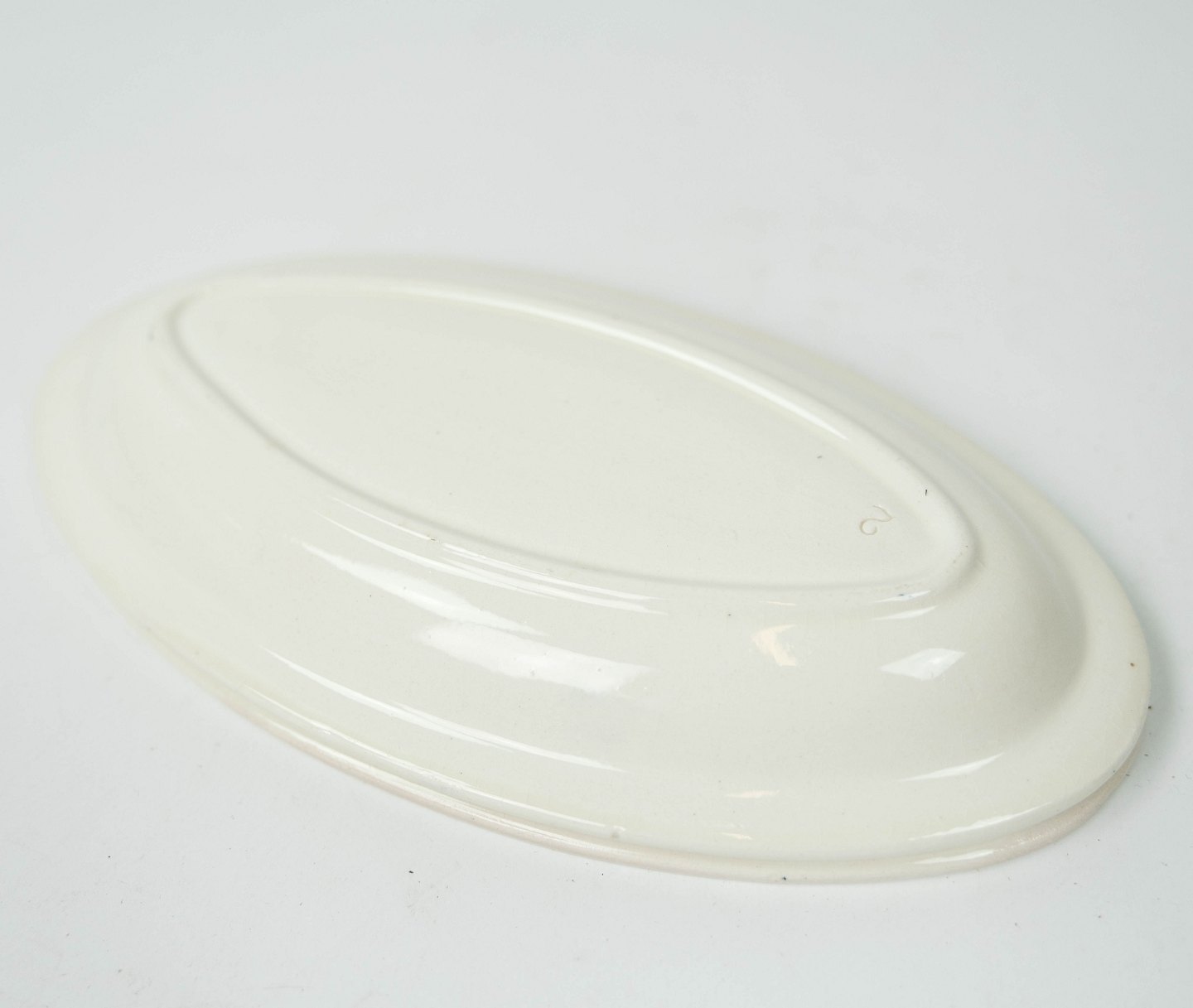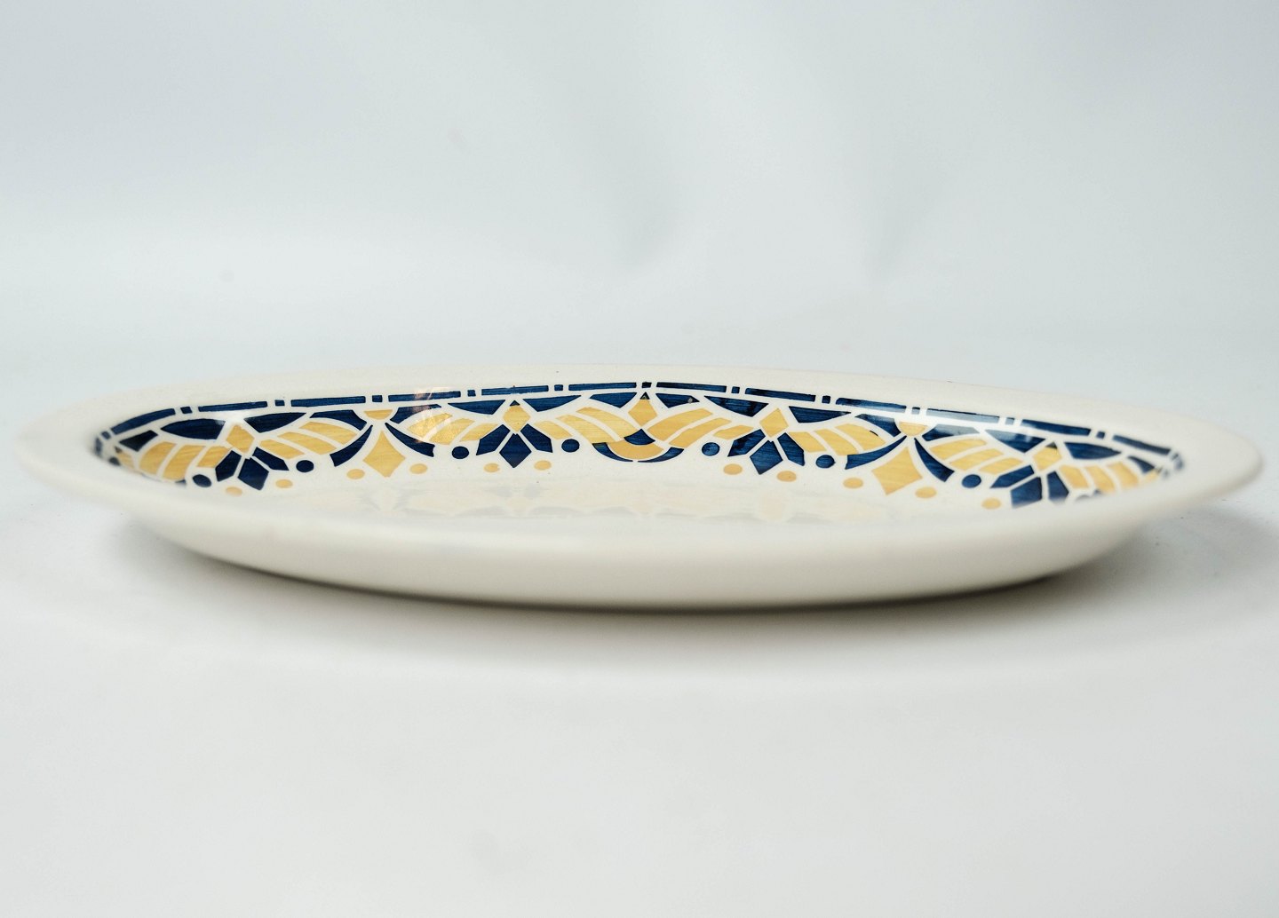 Ovalt fad dekoreret med gule og blå farver fra 1960erne. Vi har 2 stk. på lager.