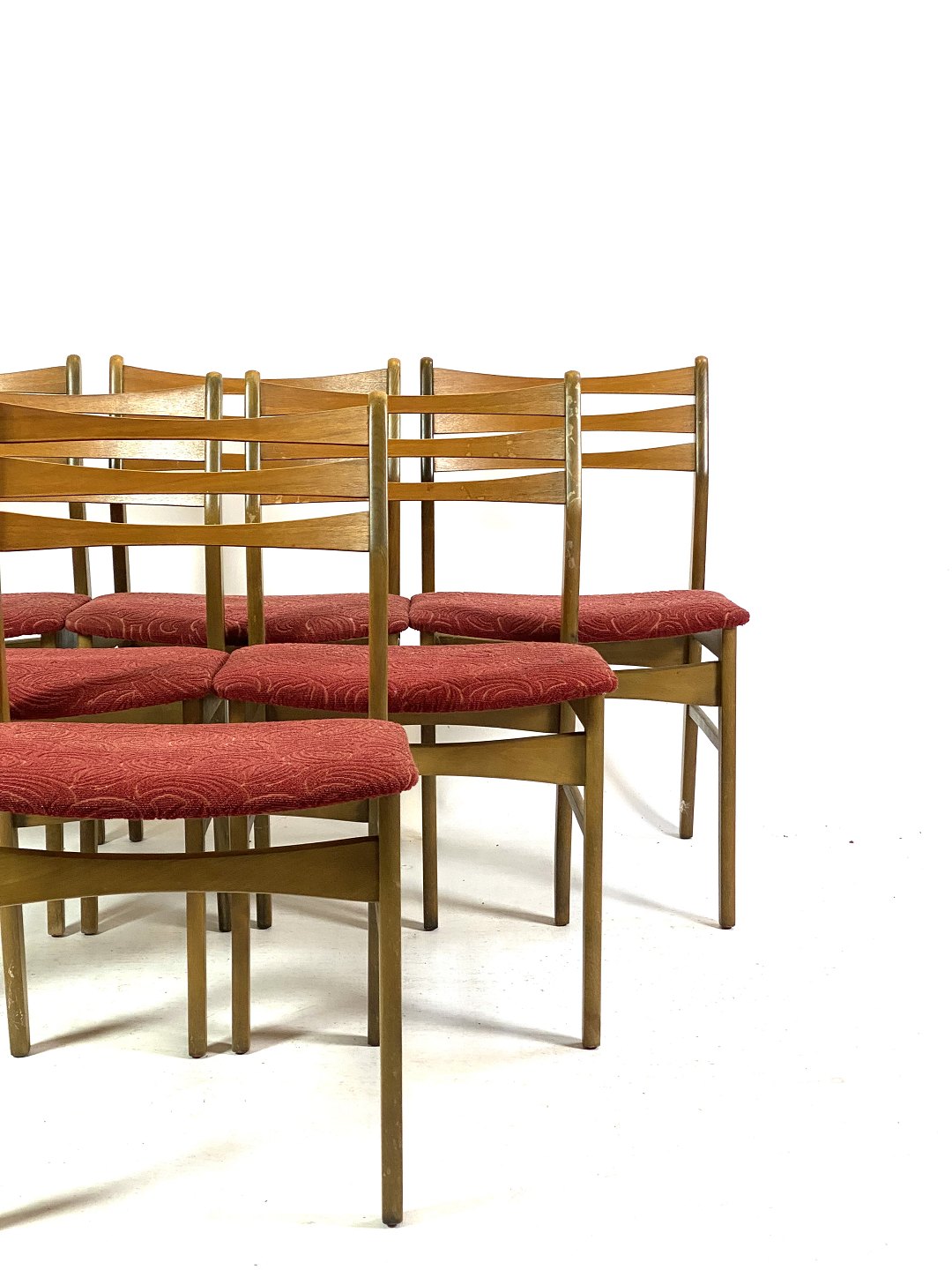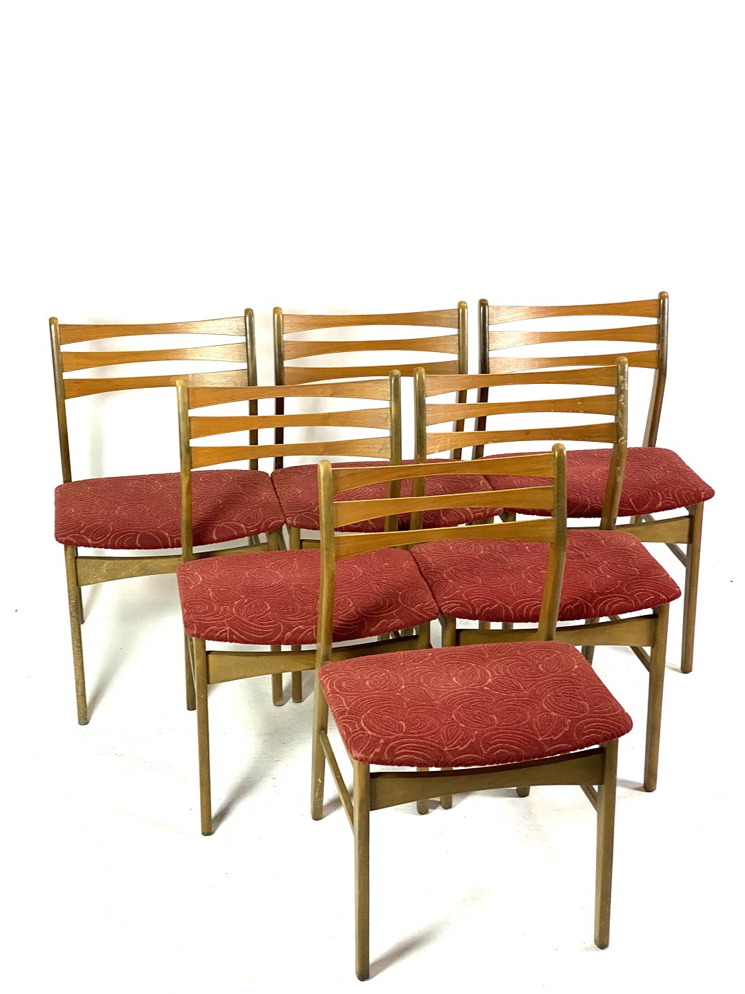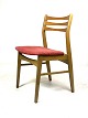 Six dining room chairs in dark polished wood and upholstered with red fabric, of Danish design from the 1960s.