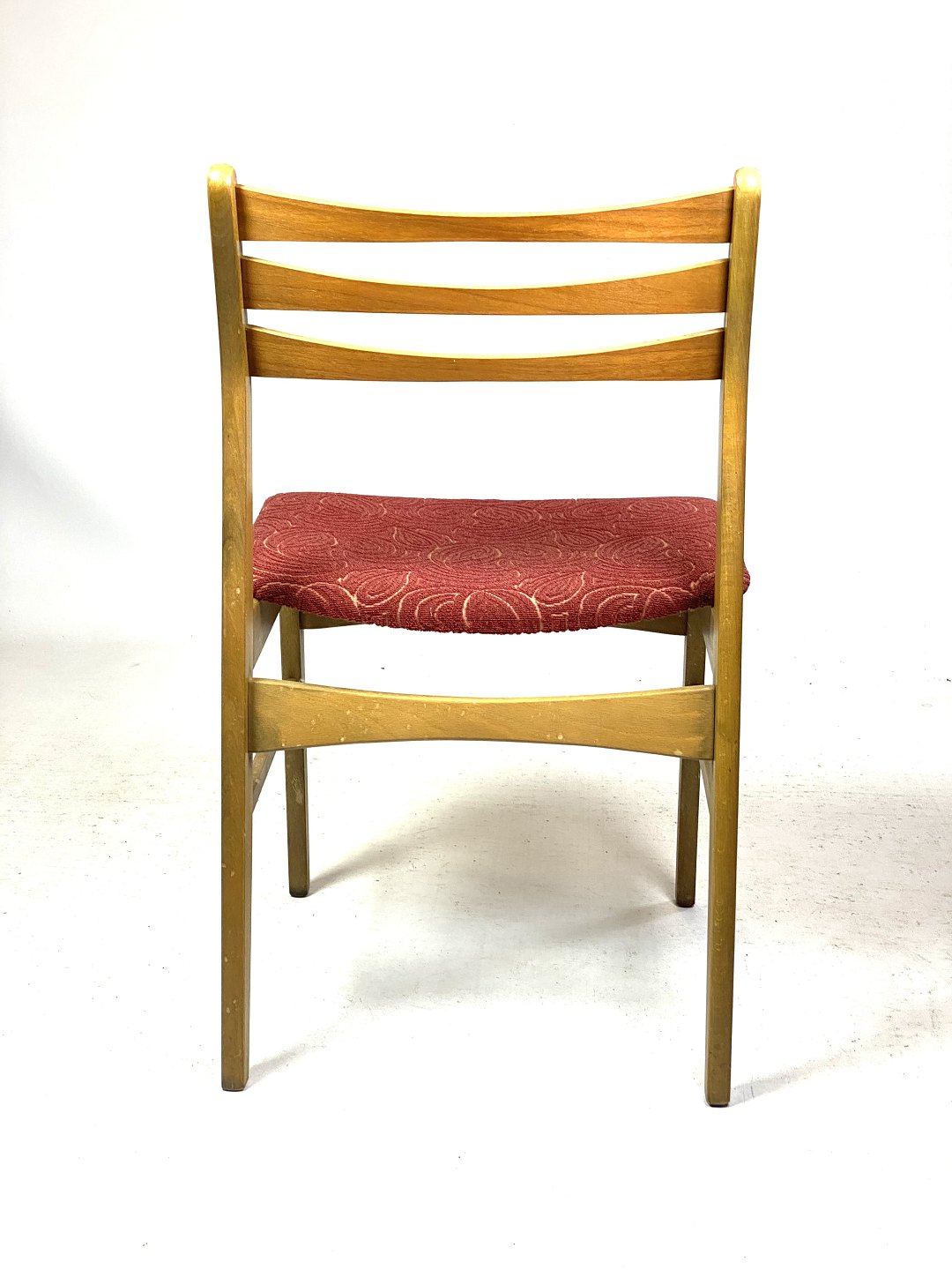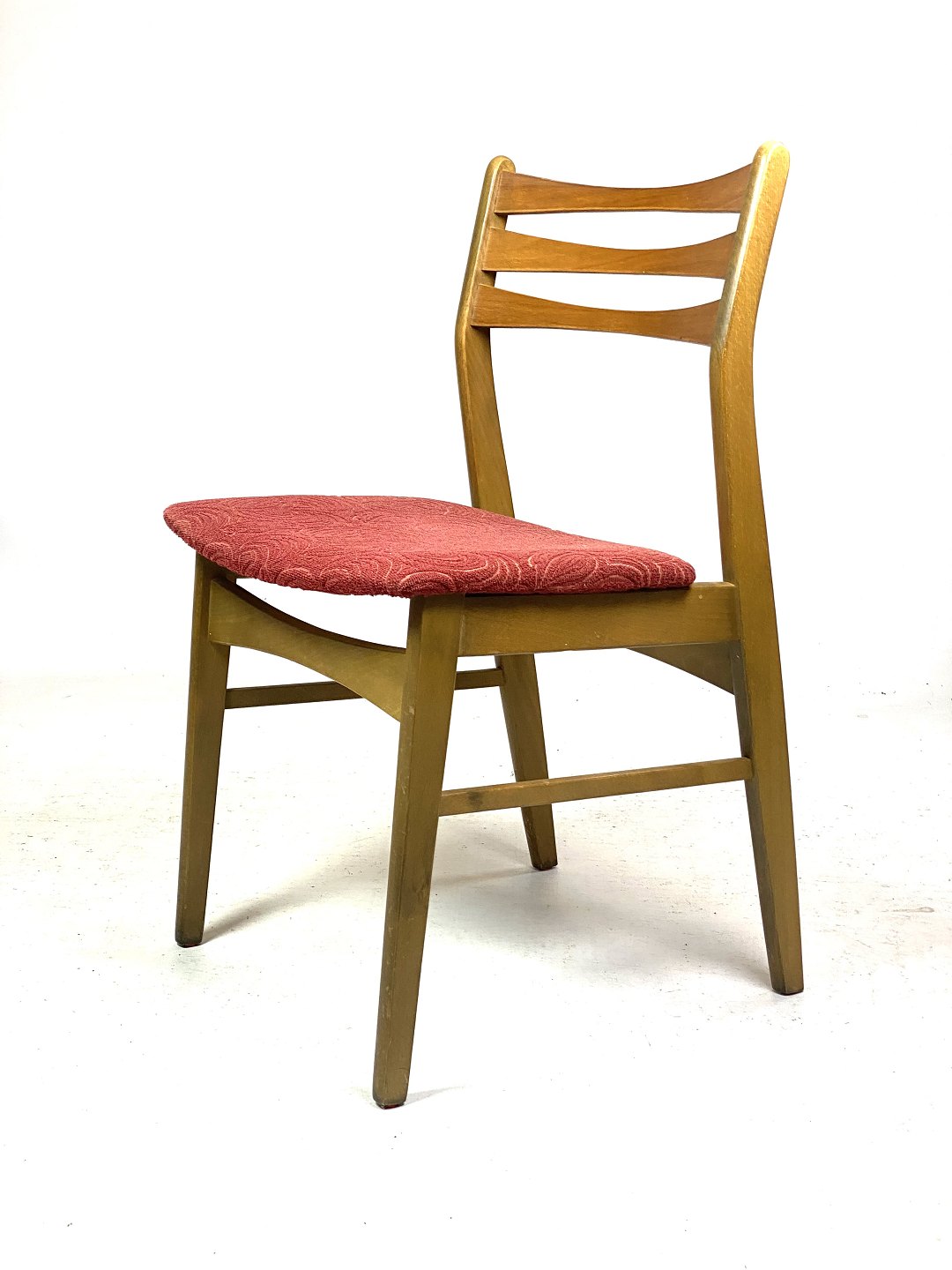Six dining room chairs in dark polished wood and upholstered with red fabric, of Danish design from the 1960s. The chairs are in great vintage condition.