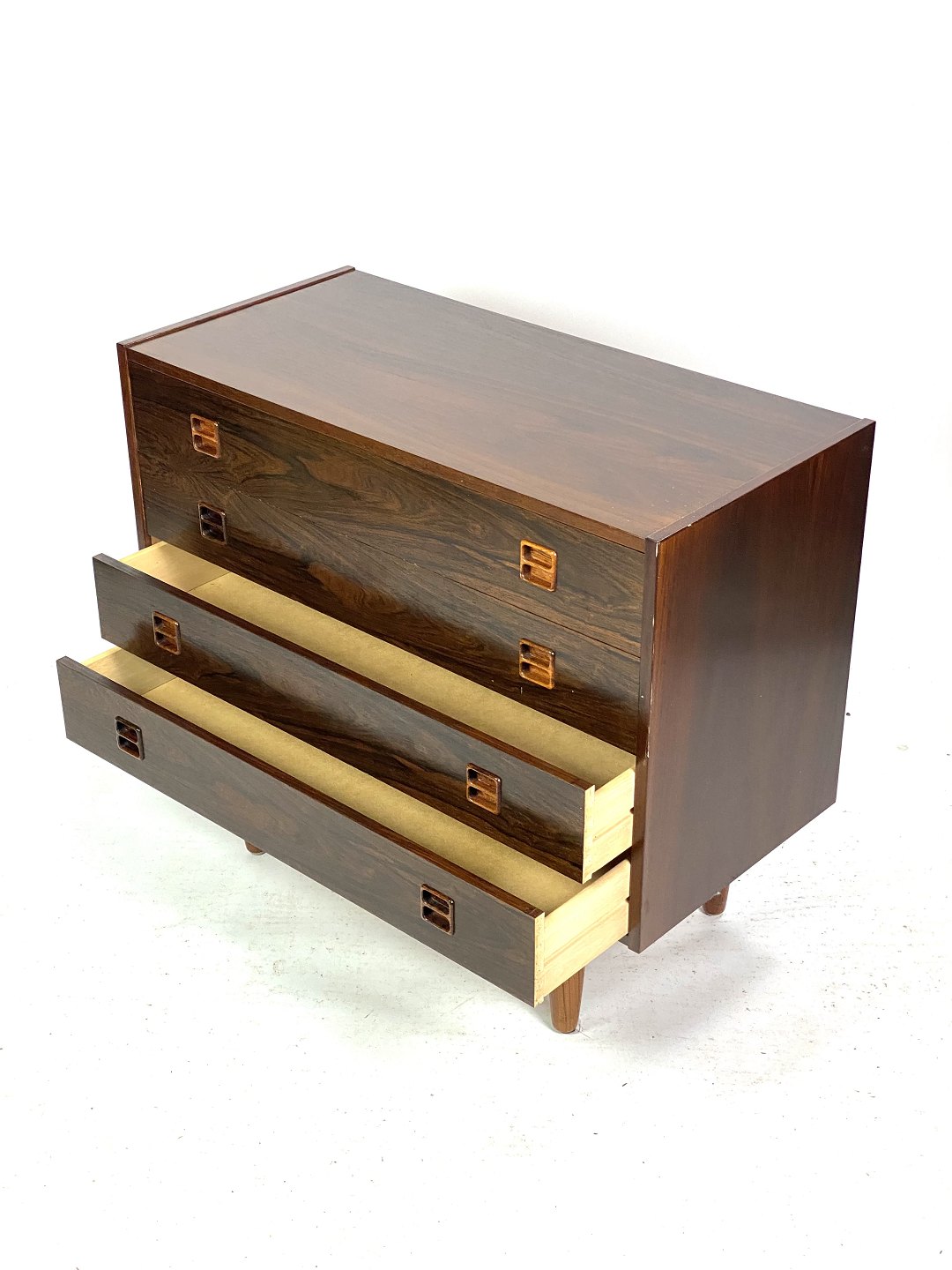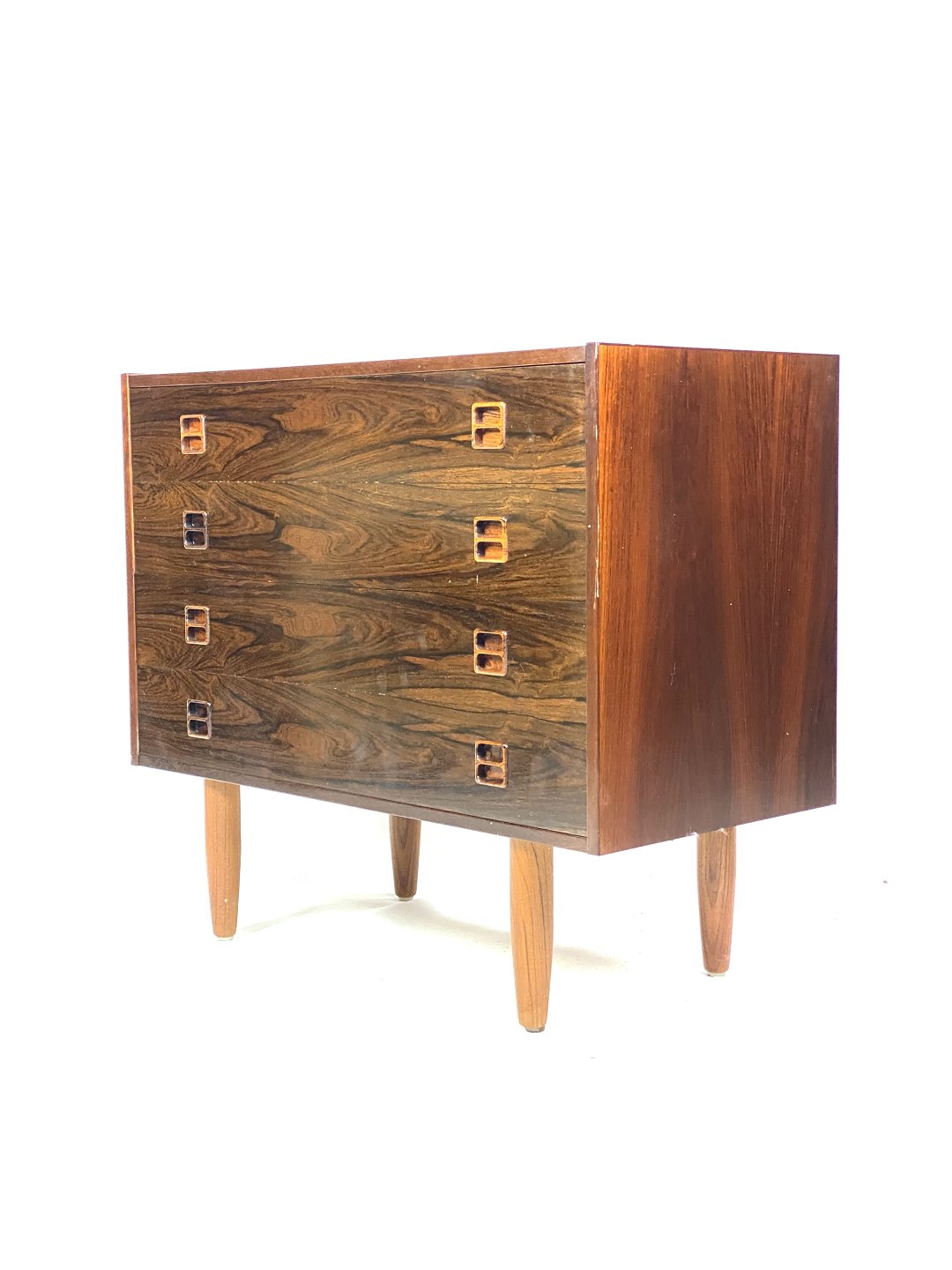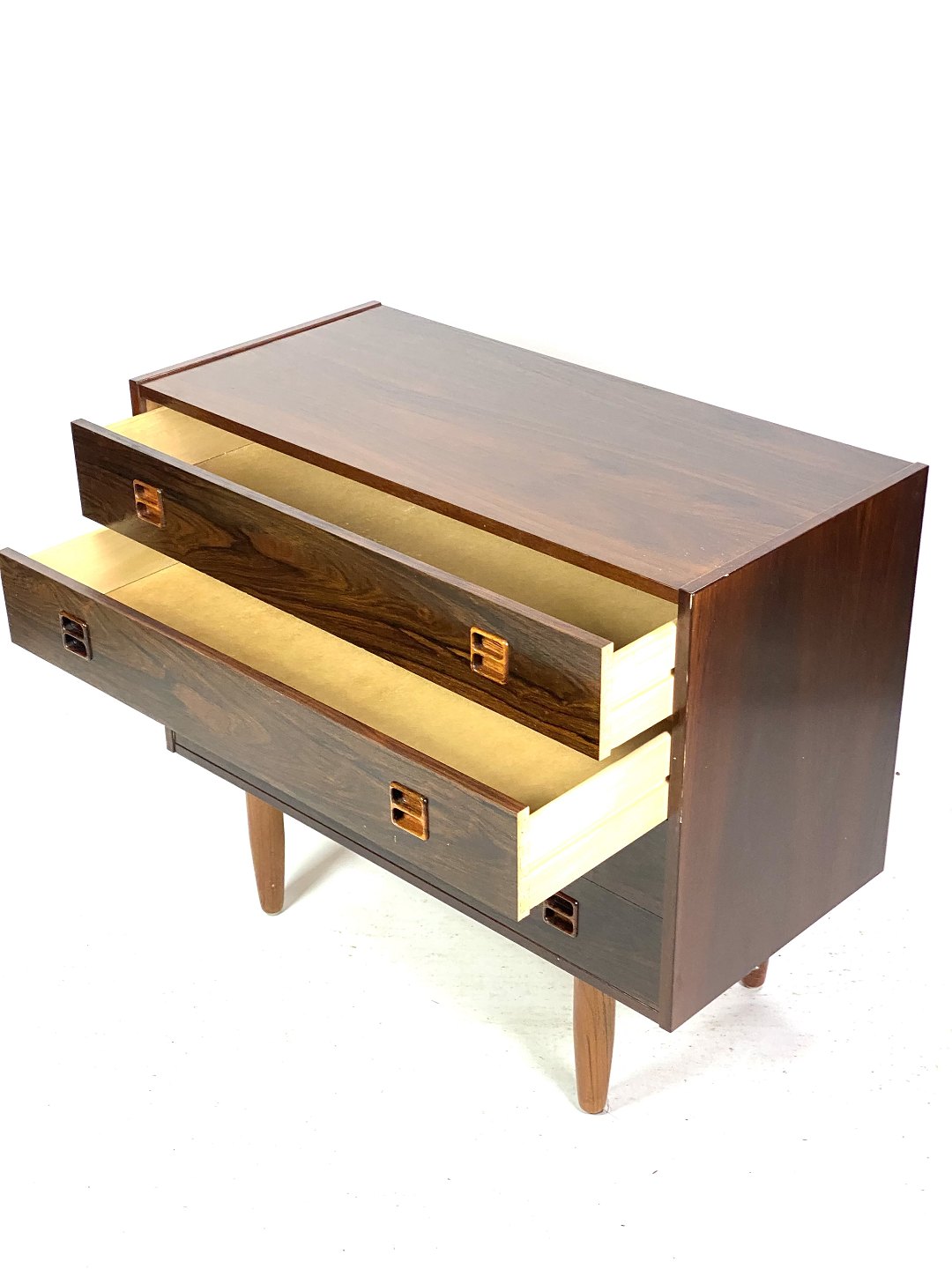 SolgtDenne kommode i palisander, designet af danske møbelarkitekter i 1960'erne, er et smukt eksempel på æstetikken fra den tid. Palisandertræet giver kommoden en varm og naturlig glød, mens dens tidløse design bringer et strejf af elegance til ethvert rum. I flot brugt stand viser kommoden stadig sin skønhed og funktionalitet efter årtier med brug. Med sine rene linjer og smukke træmønster er denne kommode en klassiker, der vil tilføre charme og karakter til enhver indretning.