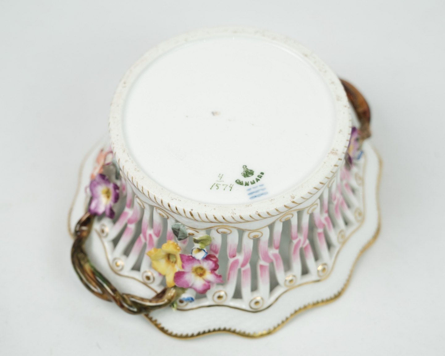 Royal Copenhagen royal bowl in breakthrough with beautiful flowers in patterned Saxon flower no. 1574. This item is incredibly beautiful and has no damage. It is before 1923 and very rare