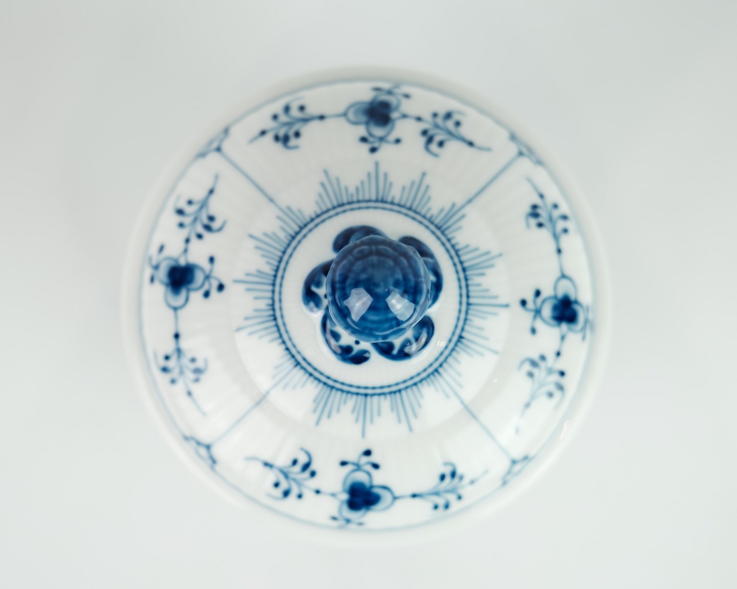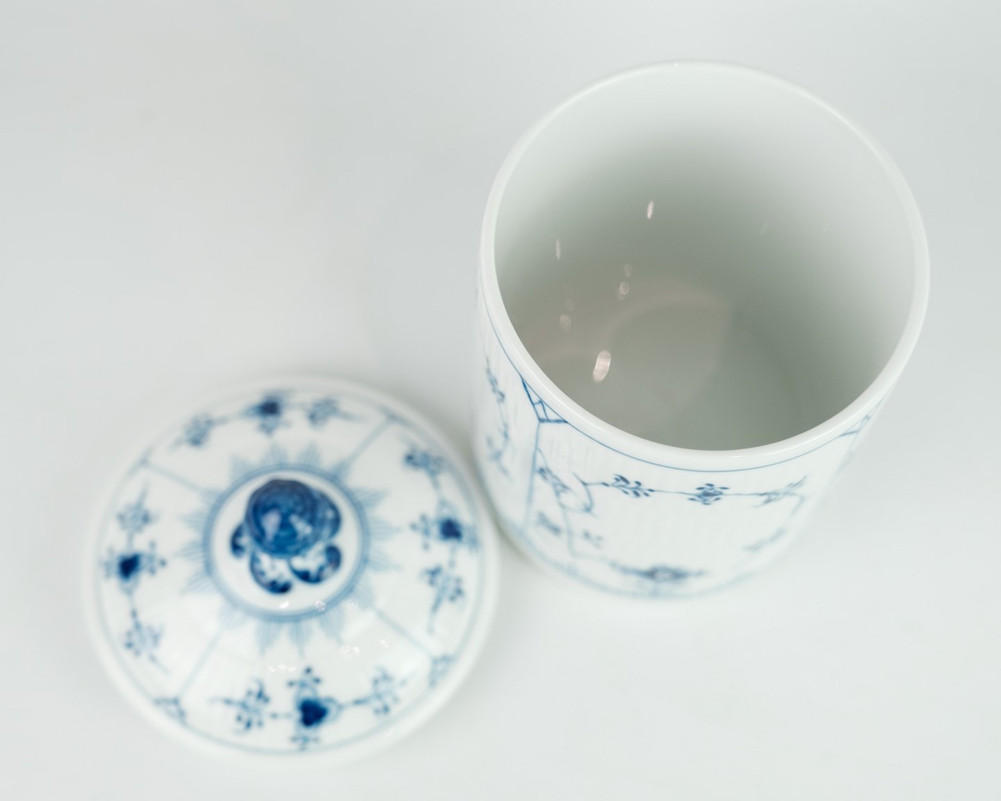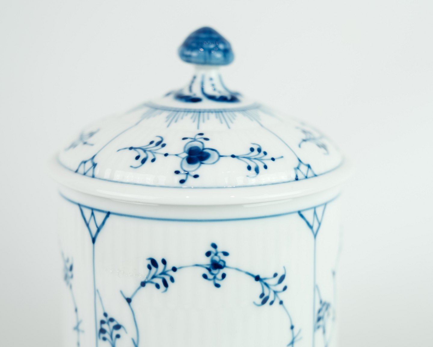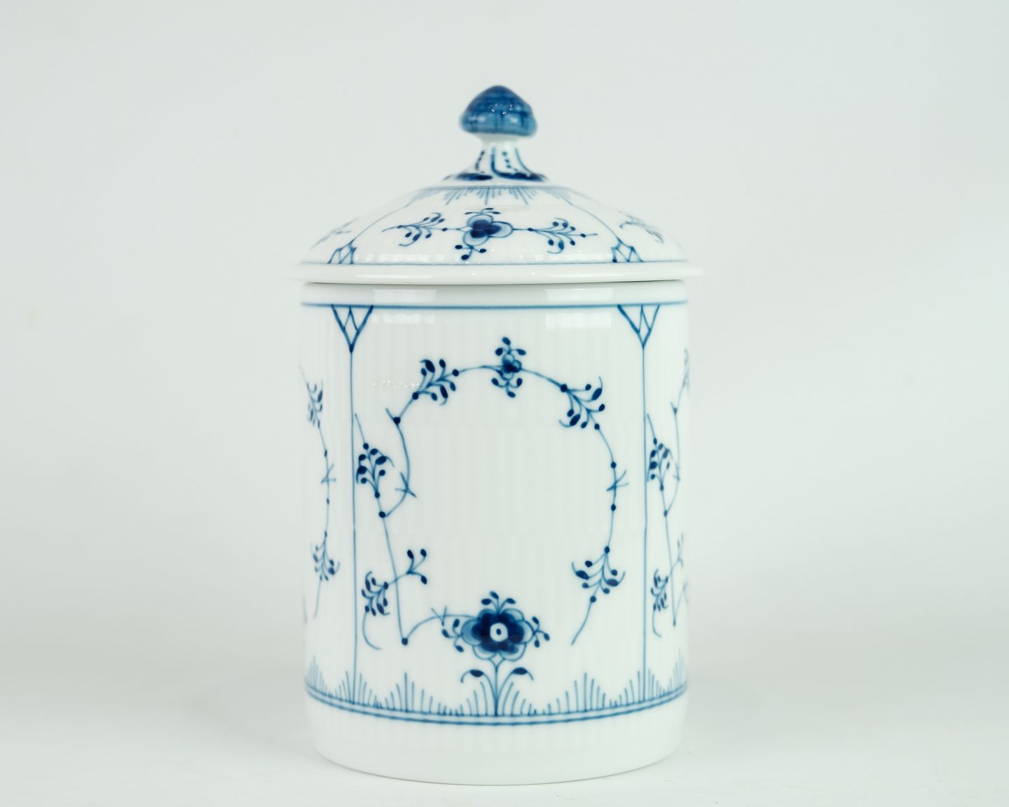 SolgtRoyal Copenhagen musselmalet riflet krukke med låg egnet til te / kaffe / småkager.
