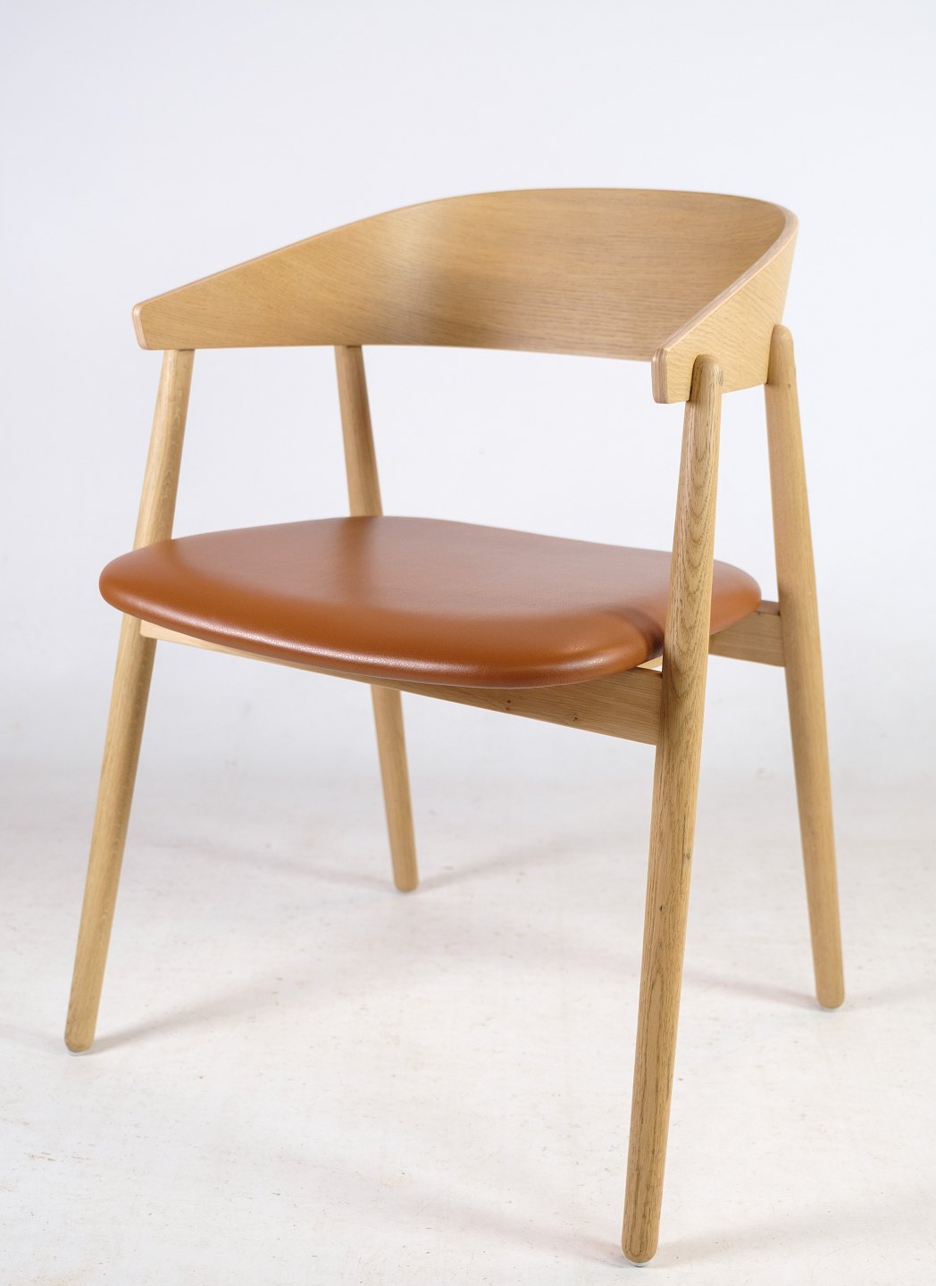 SolgtSæt af 4 spisestuestole, model AC2, af Andersen i sæbebehandlet egetræ. Står med flot betrukket sæder i cognac.