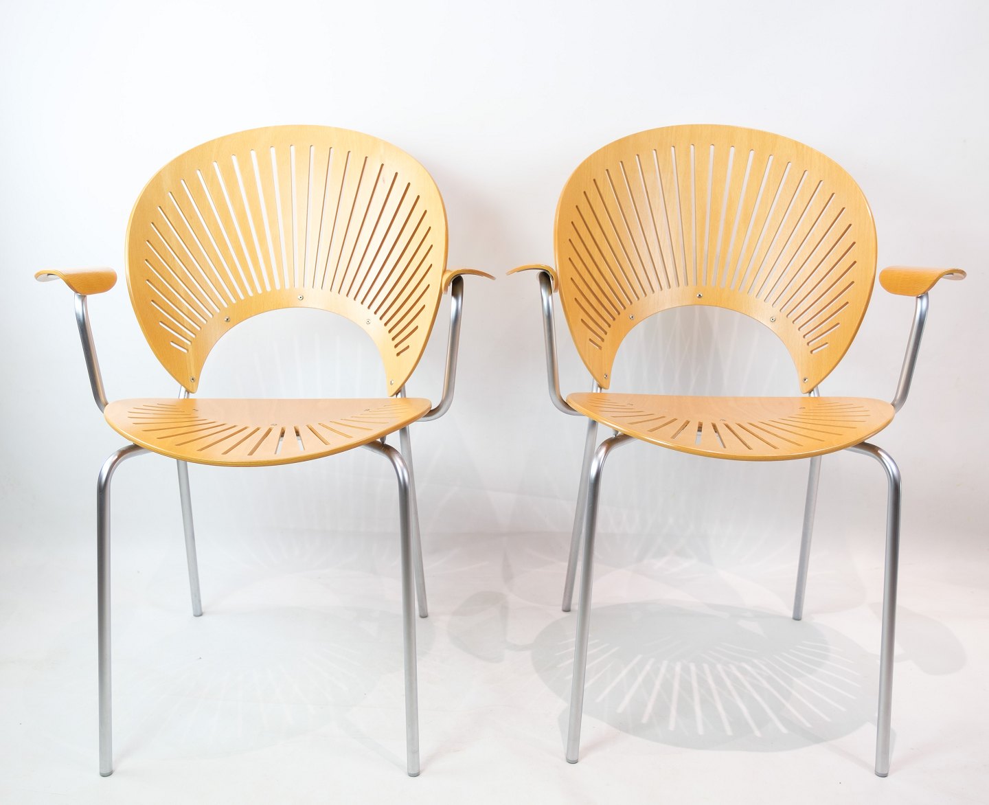 SolgtTrinidad Armstol, model 3297, designet af Nanna Ditzel (1923 - 2005) med skaller af bøgetræ med stel af forkromet stål fremstillet hos Fredercia Furniture.