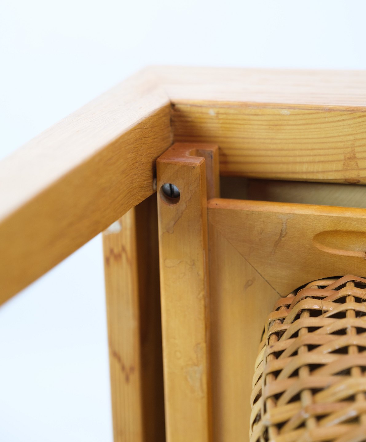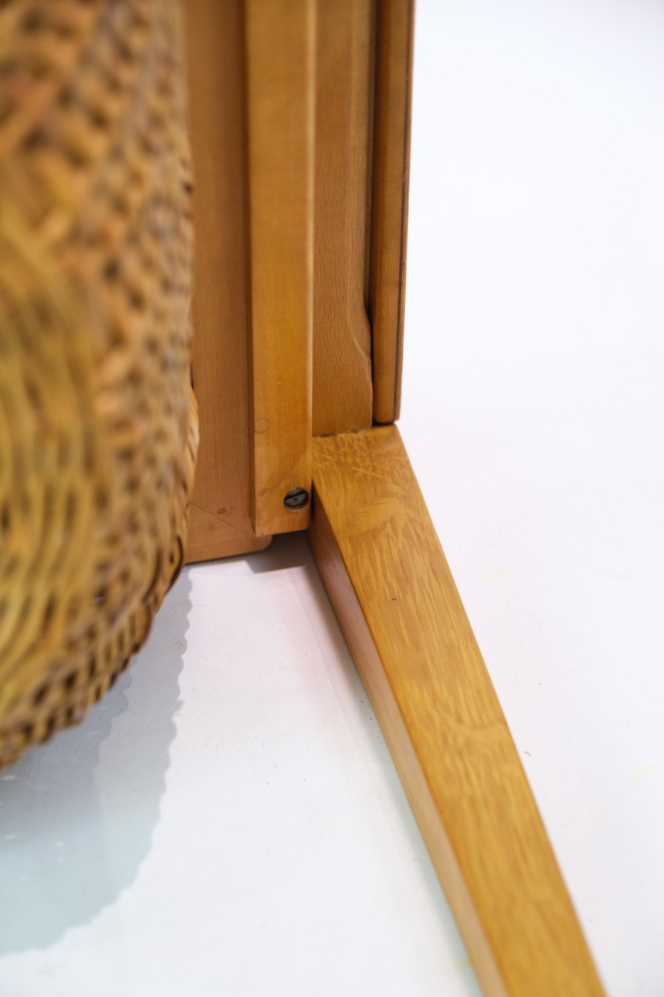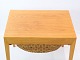 Sybord / sidebord, designet af Severin Hansen i egetræ fremstillet af Haslev møbelfabrik fra 1957. Bordet har en skuffe med små rum, samt en udtrækskurv med flet.