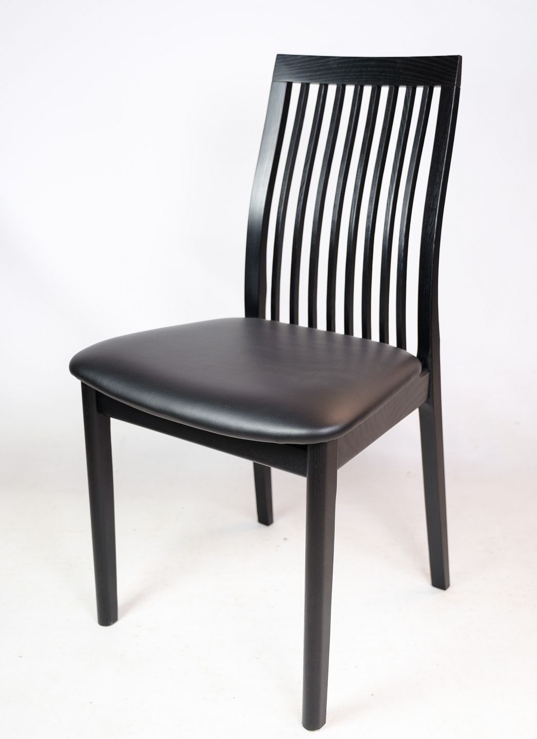 Sæt af 4 spisestuestole, model 712, i sort bejdset ask fremstillet af K. Høffer Larsen A/S. Mellemhøj spisestuestol, med lodrette pinde i ryggen, der giver god siddekomfort.