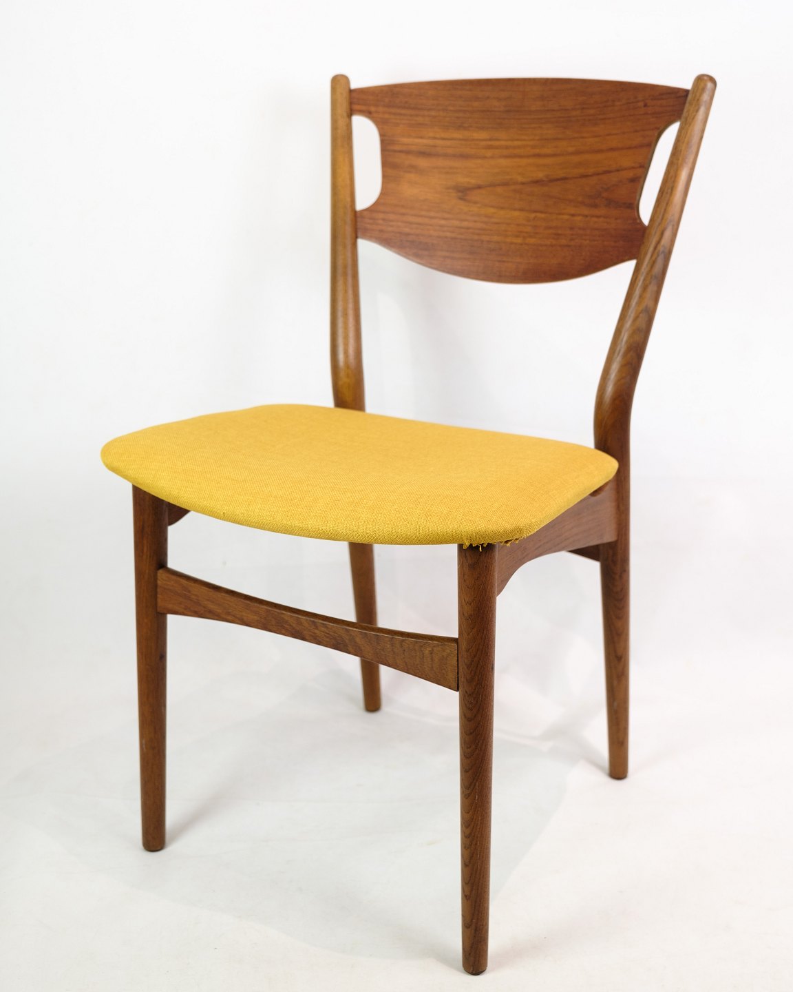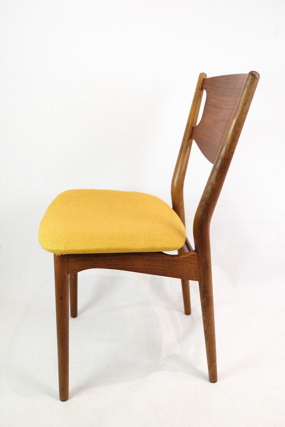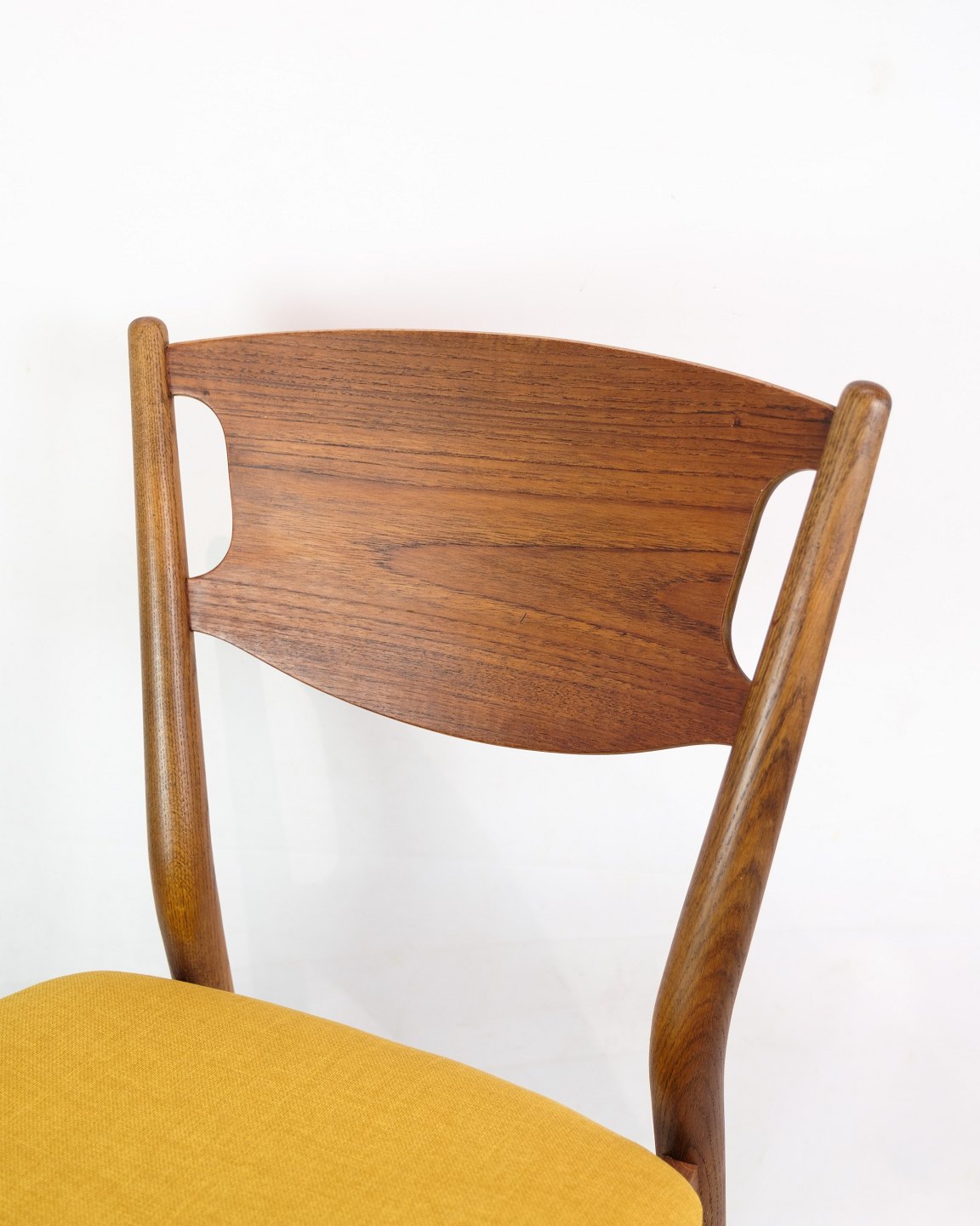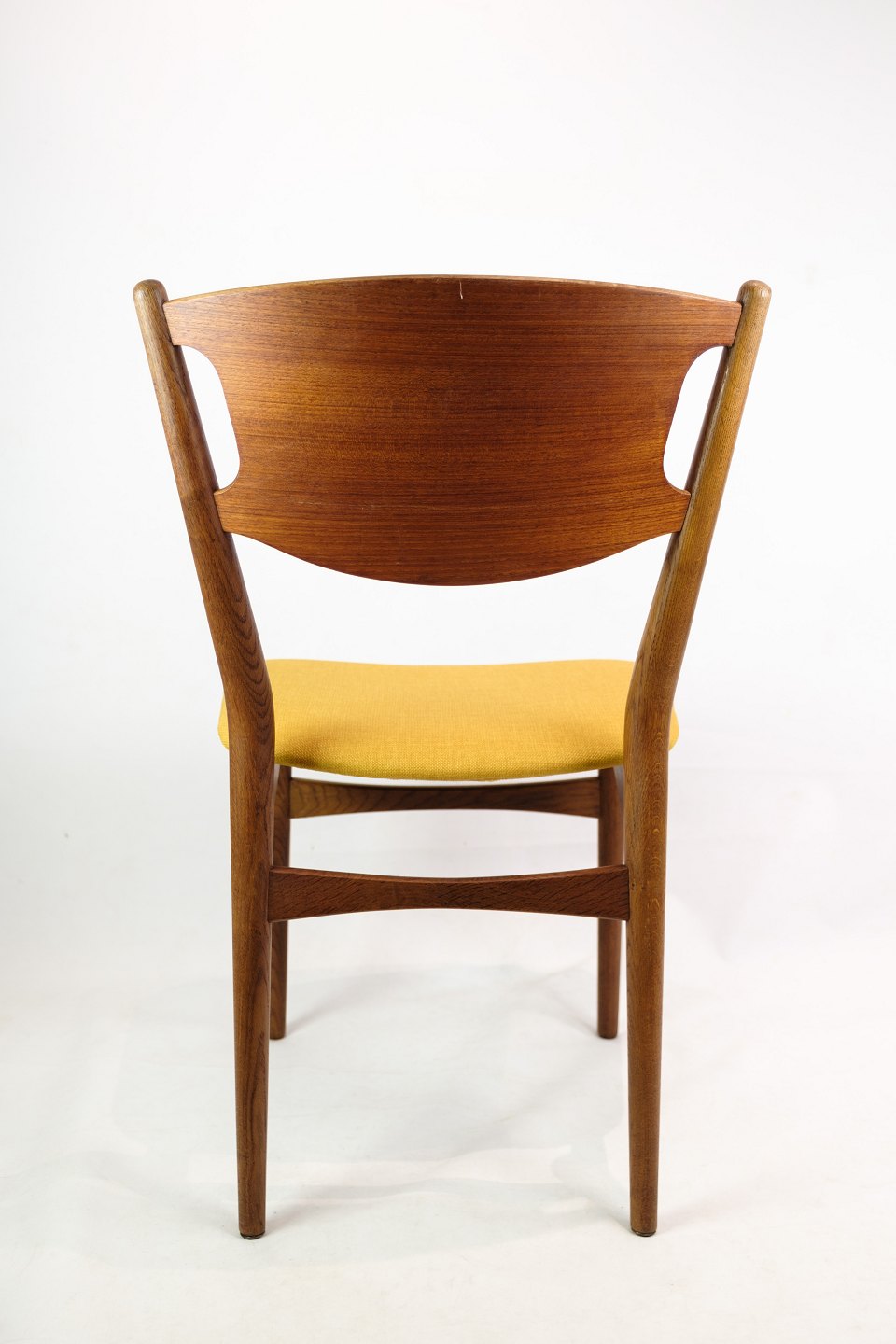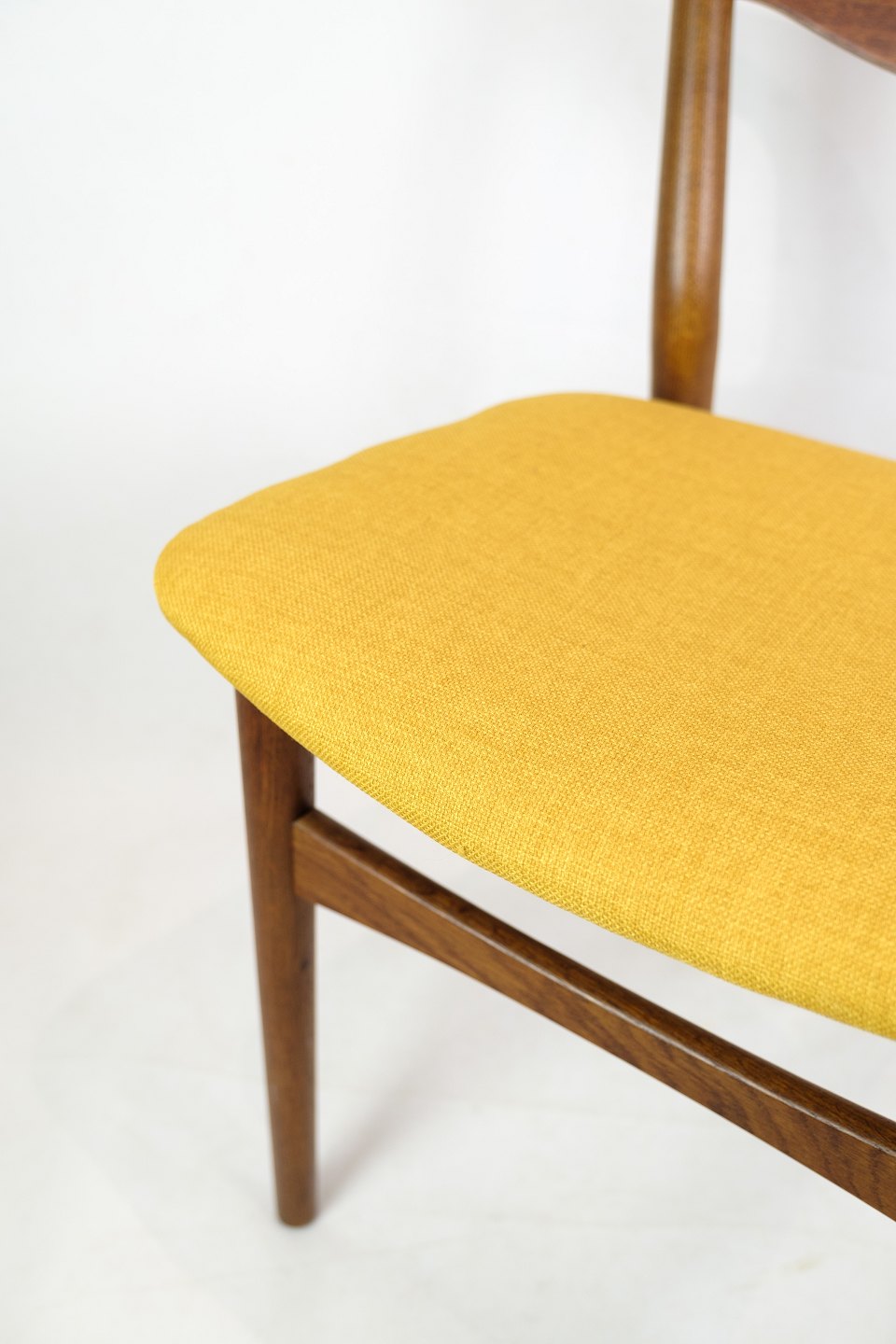 The 42A chair set is a mid-century modern design classic from Sibast Furniture. Designed in 1953, the chairs have a beautifully crafted oak frame and a comfortable teak back. The set comes with six chairs upholstered in a stylish yellow fabric that perfectly complements the warm tones of the wood. These chairs are not only aesthetically pleasing but also incredibly comfortable, making them perfect for both formal and informal settings. The clean lines and timeless design of the 42A chair set ensure that they will continue to be a sought-after piece of furniture for years to come.