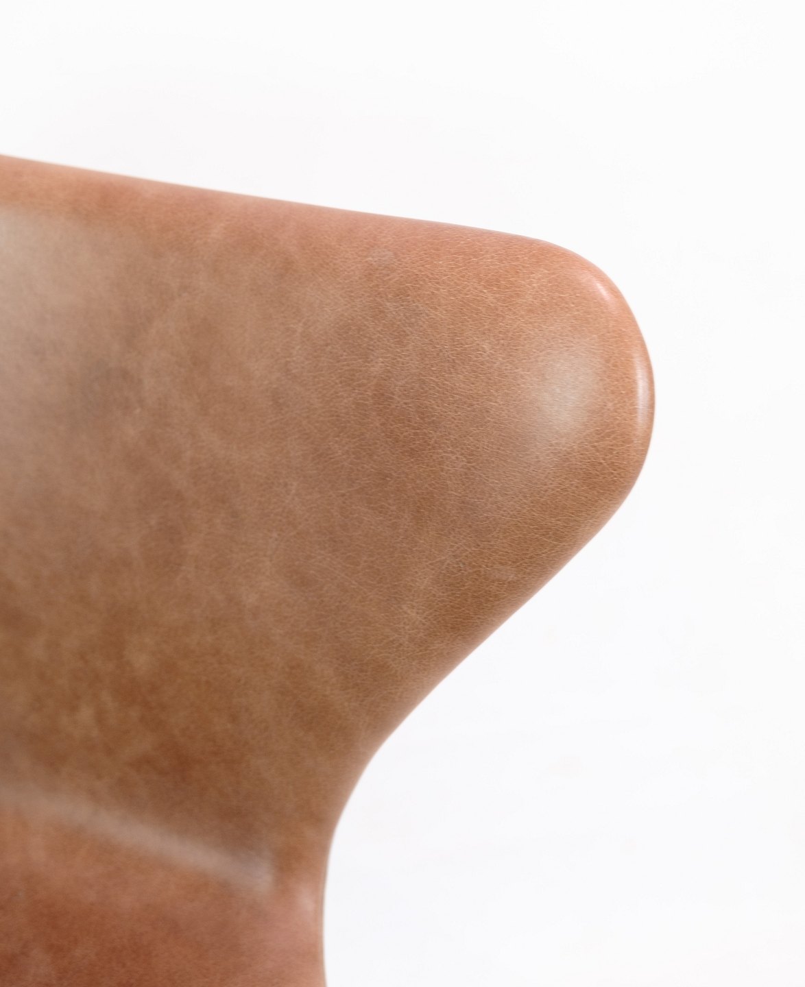A set of 6 Seven chairs, model 3107, designed by Arne Jacobsen and manufactured by Fritz Hansen. The chairs are upholstered in light brown elegance leather and in very nice used condition with original patina.