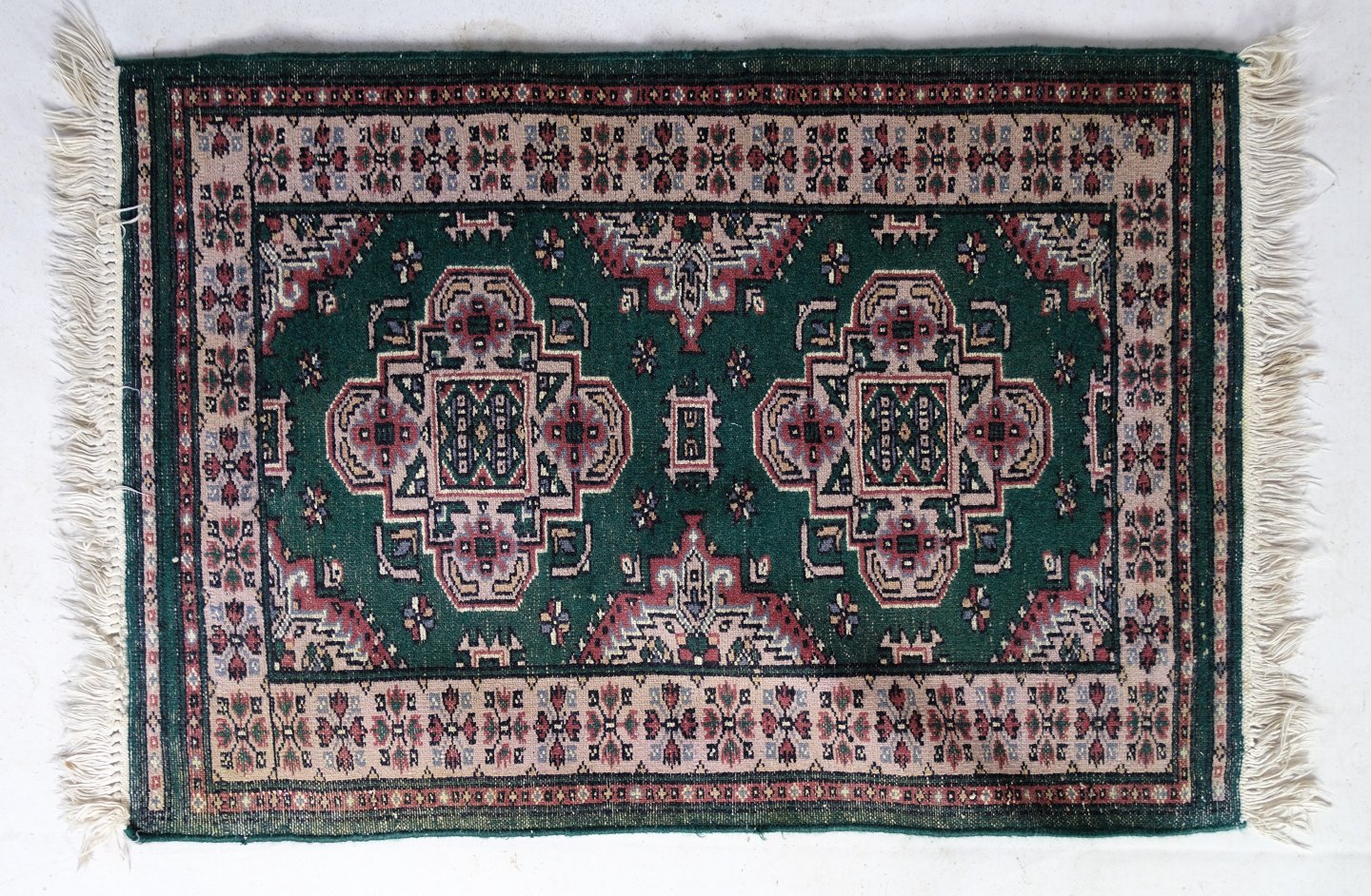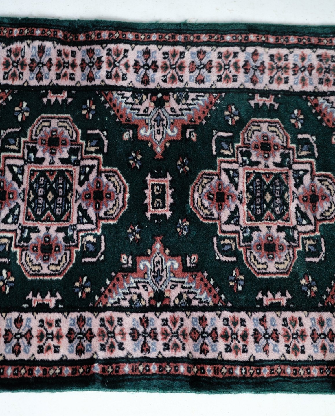 Et ægte persisk tæppe fremstillet i hånden mønstret og indfarvet med grønnelige farver.
