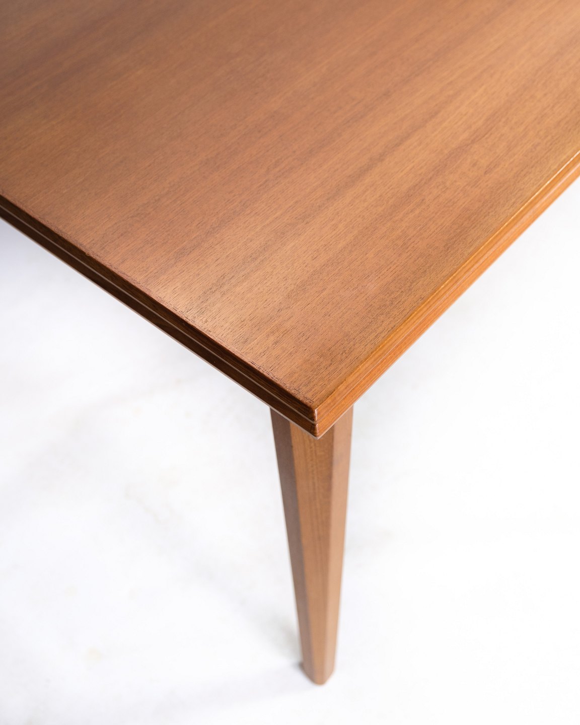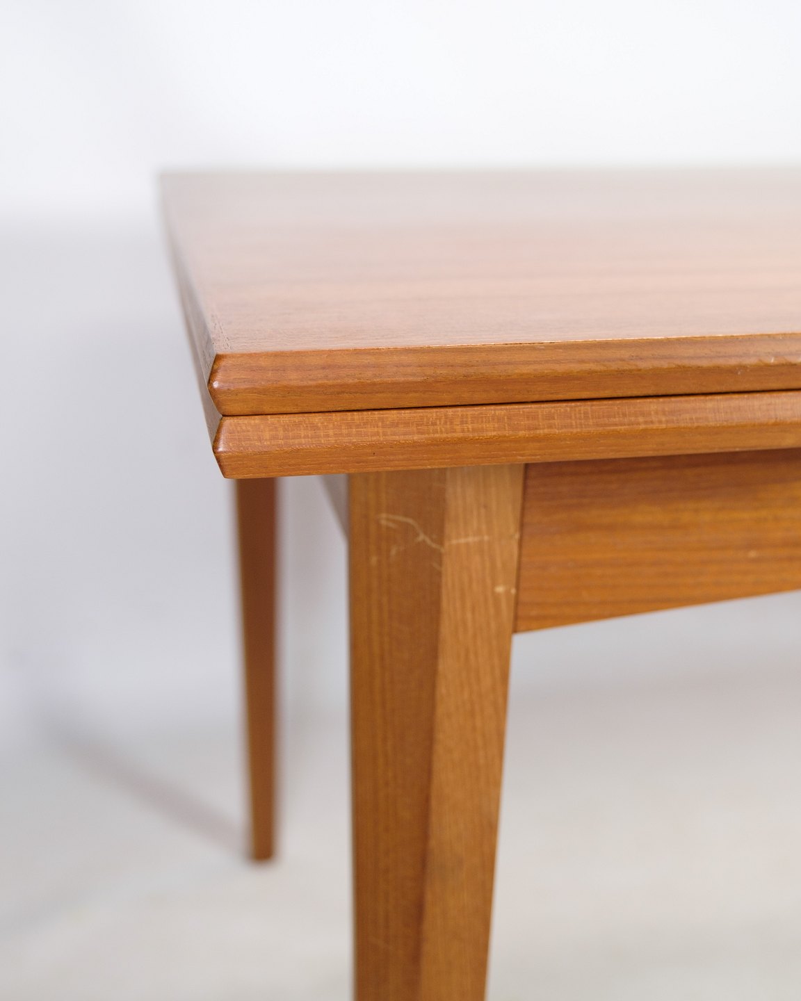 This dining table in teak is a beautiful and functional piece of furniture in Danish design from the 1960s. The table is made of high-quality teak wood, which is known for its durability and natural beauty. The design includes a Dutch extension, which allows the table to be extended when more space is needed to sit.