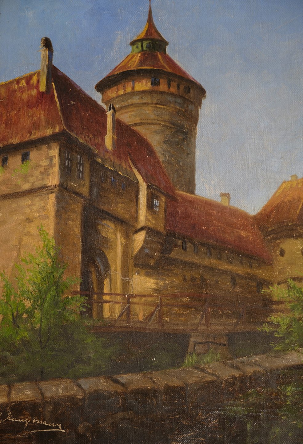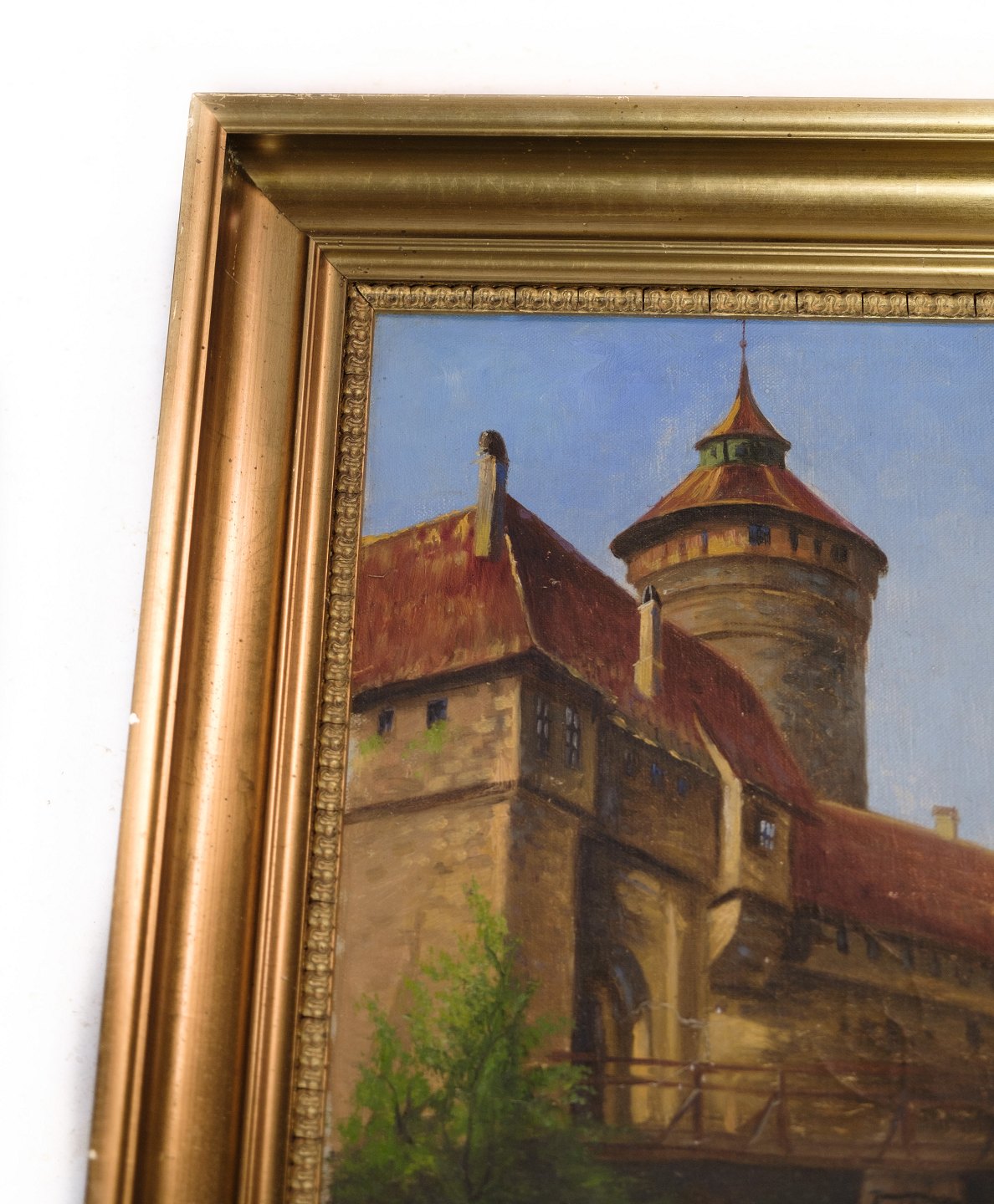 Painting on the canvas in a gold frame of a church motif in yellow and red shades from around the 1930s.