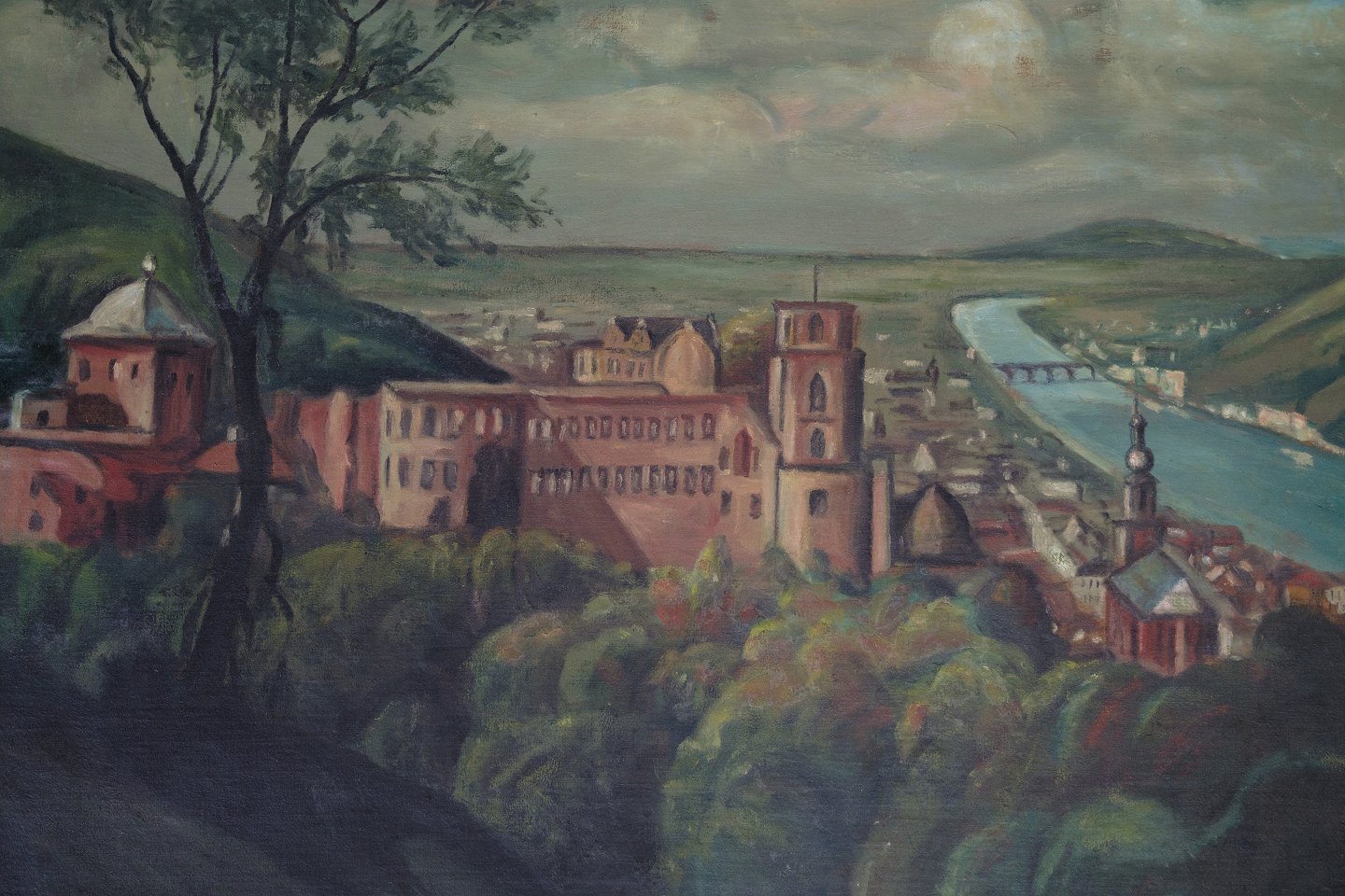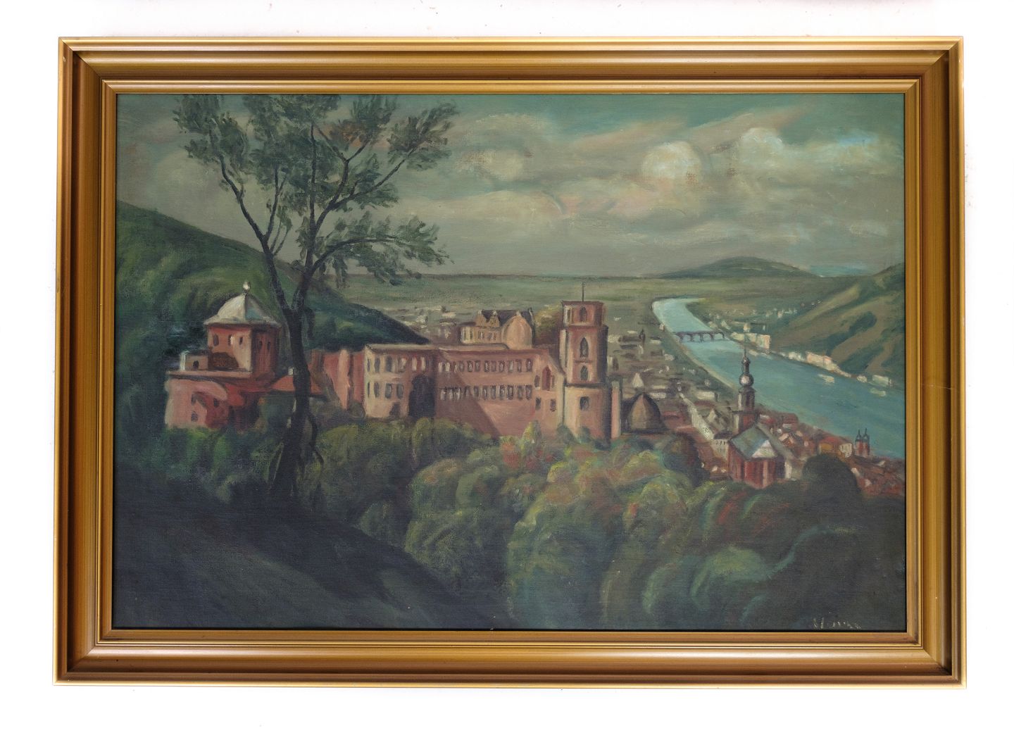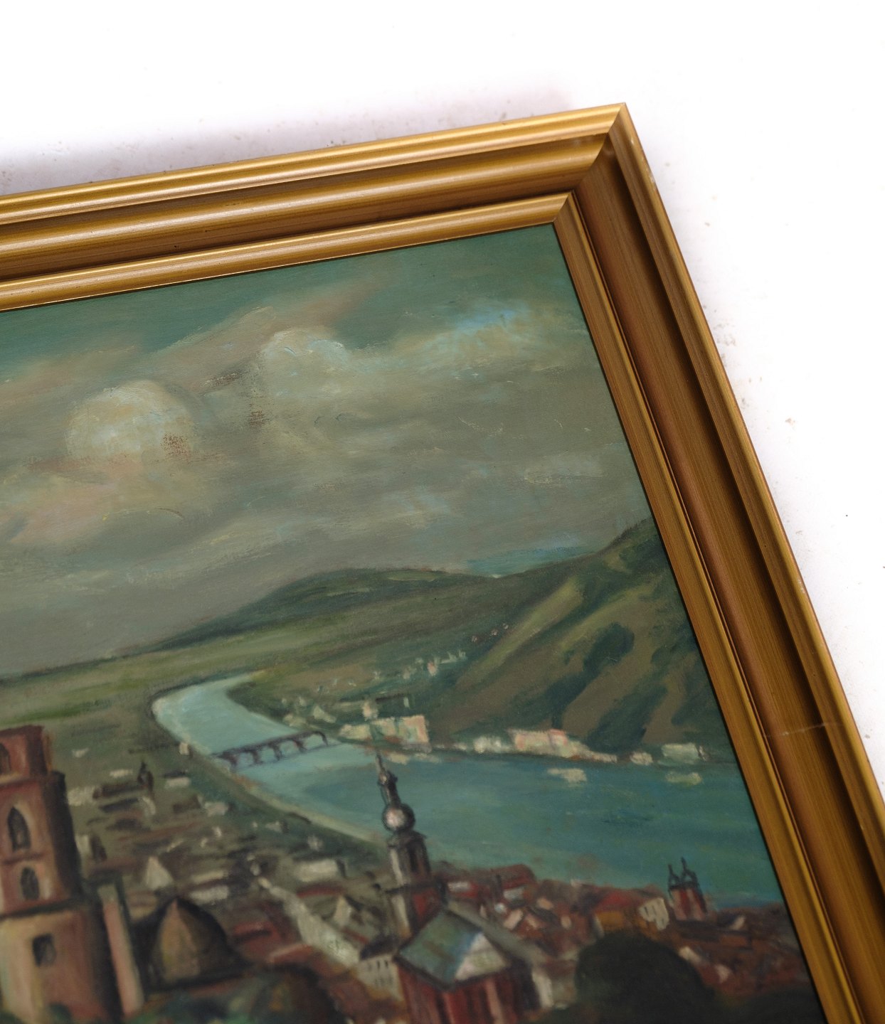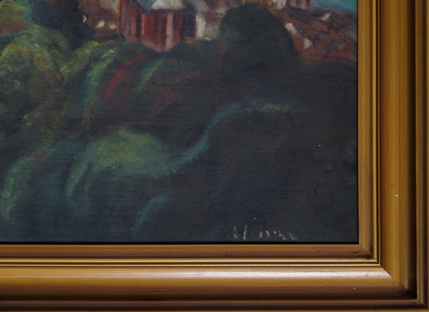 Maleri på lærredet i guldramme motiv af stor landsby fra omkring 1930'erne