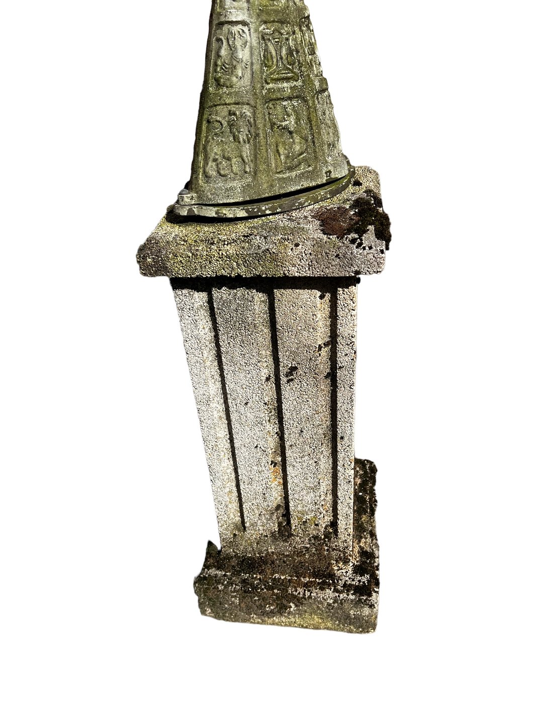Sun clock made of iron, copper and zinc metal on a plinth of artificial stone. The sundial appears with a patina.