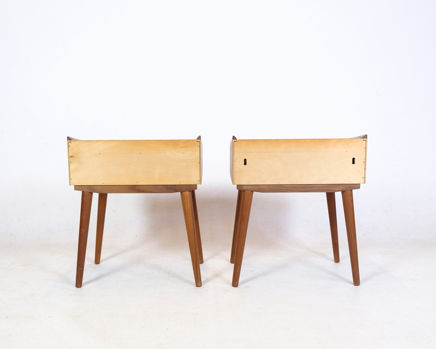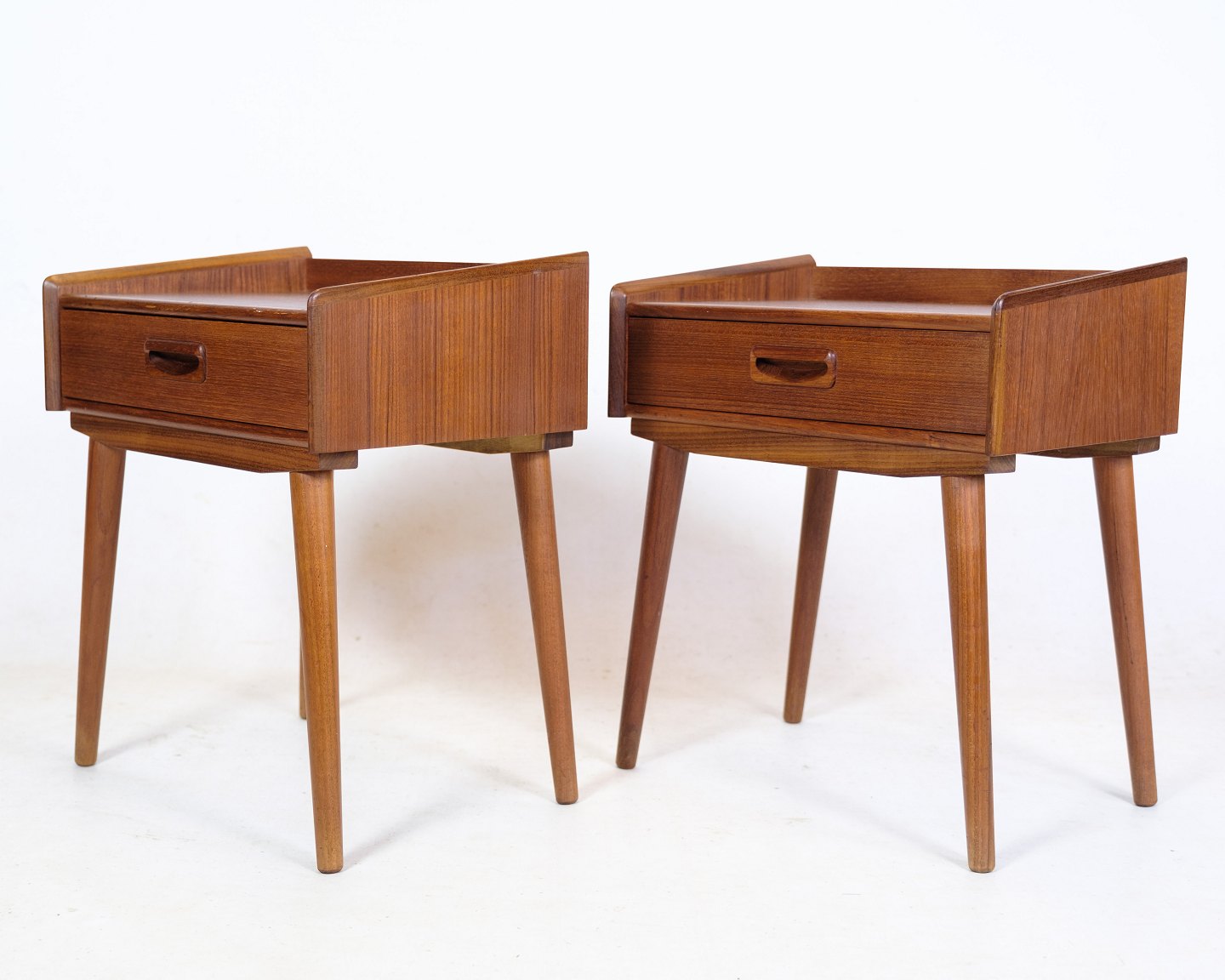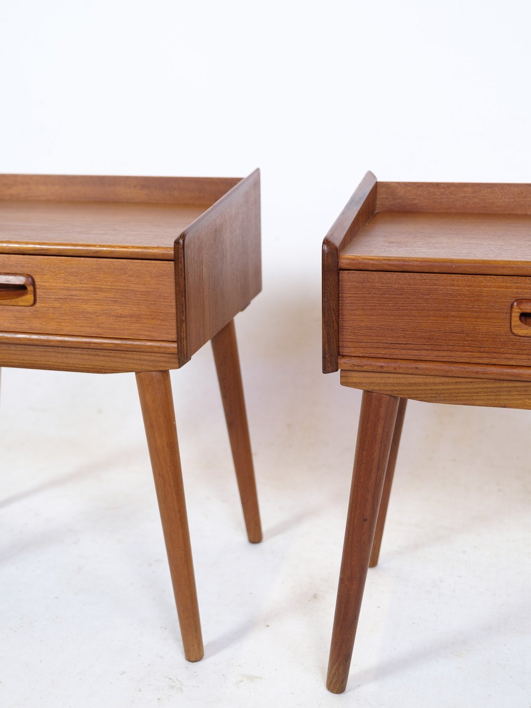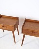 SolgtEt sæt af 2 natborde af dansk design i teaktræ med skuffe med håndtag fra omkring 1960'erne.