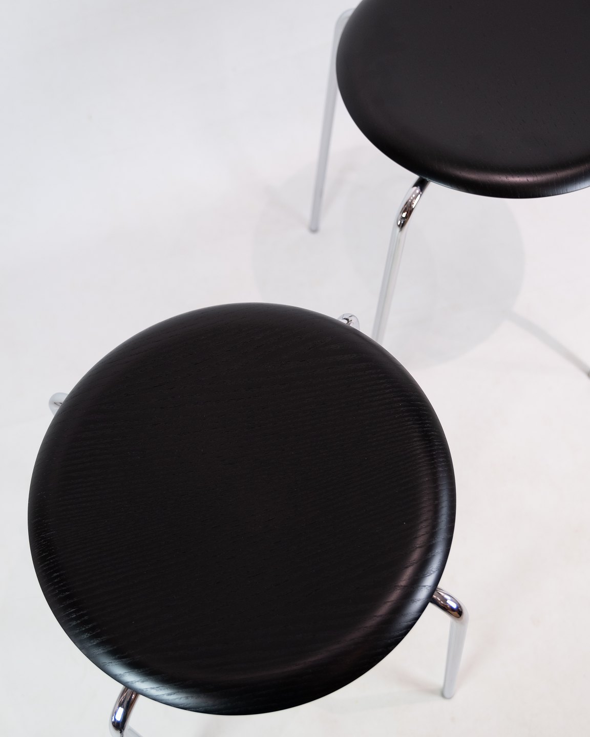 Skamlerne har en stel af forkromet stålrør, der giver dem en let og elegant fremtoning. Sædet er lavet af sort askefiner, der tilføjer varme og kontrast til det strømlinede stålstel. Den enkle og funktionelle form gør disse skamler velegnede til en lang række indretningsstile og anvendelsesformål.