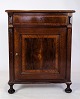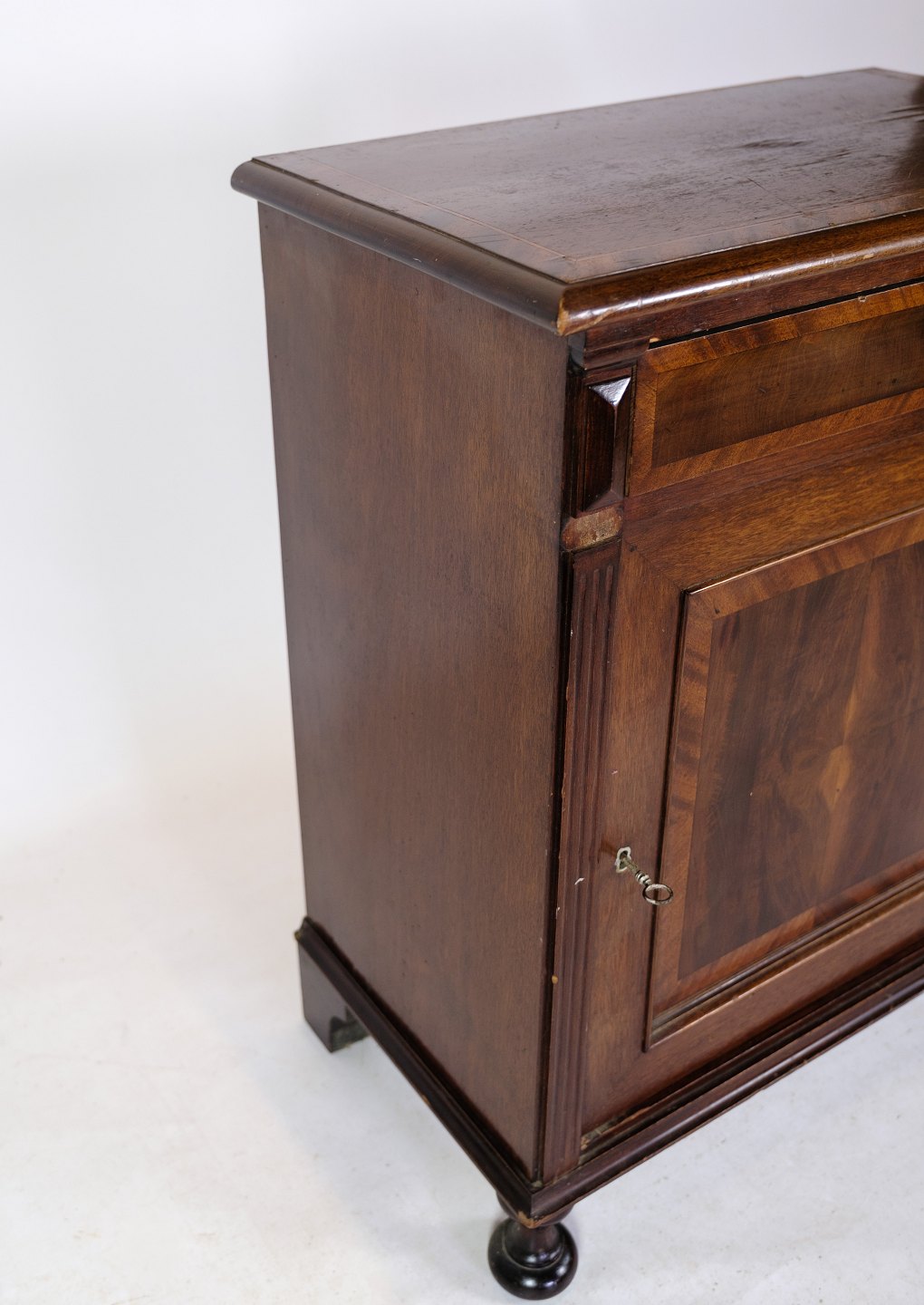 Mahogany console with inlaid walnut wood and round legs from around the 1880s.