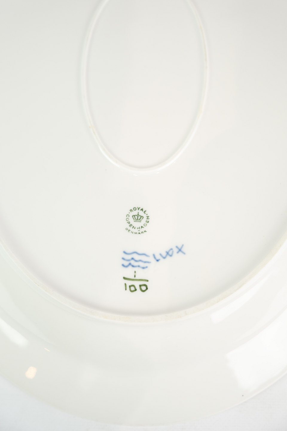 Nummeret 1/100 refererer til fadets unikke design og dekoration, og det er en smuk repræsentation af Royal Copenhagens mesterværker og deres høje standard for kvalitet og detaljer.