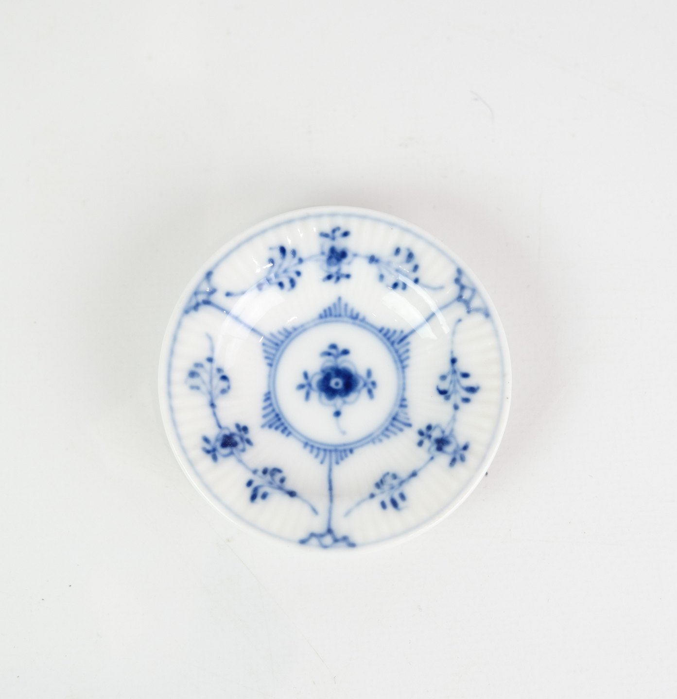 Royal Copenhagen Musselmalet Riflet kuvert smør asiet med dekorationsnummer 1/7 og mærket som "1. sort" er et raffineret stykke porcelæn, der bringer tidløs elegance til din borddækning.