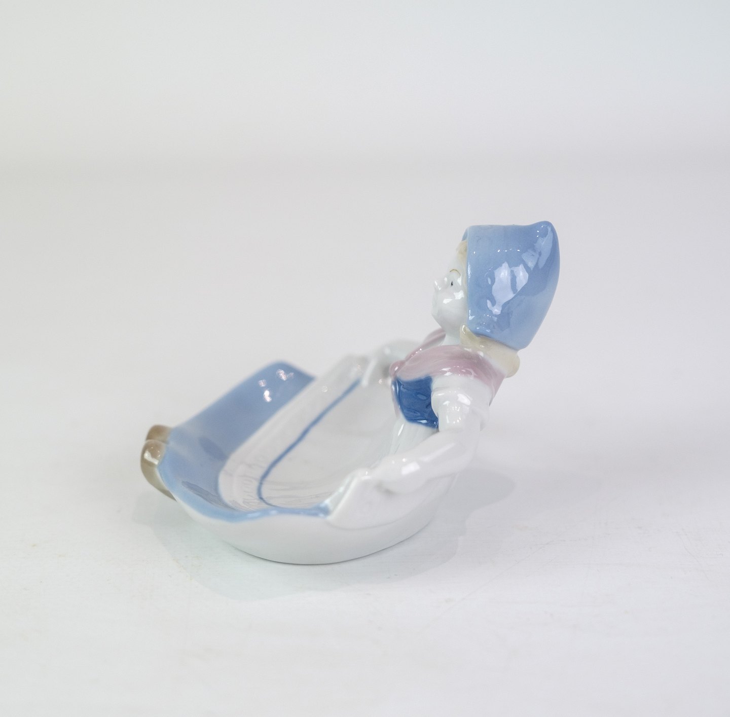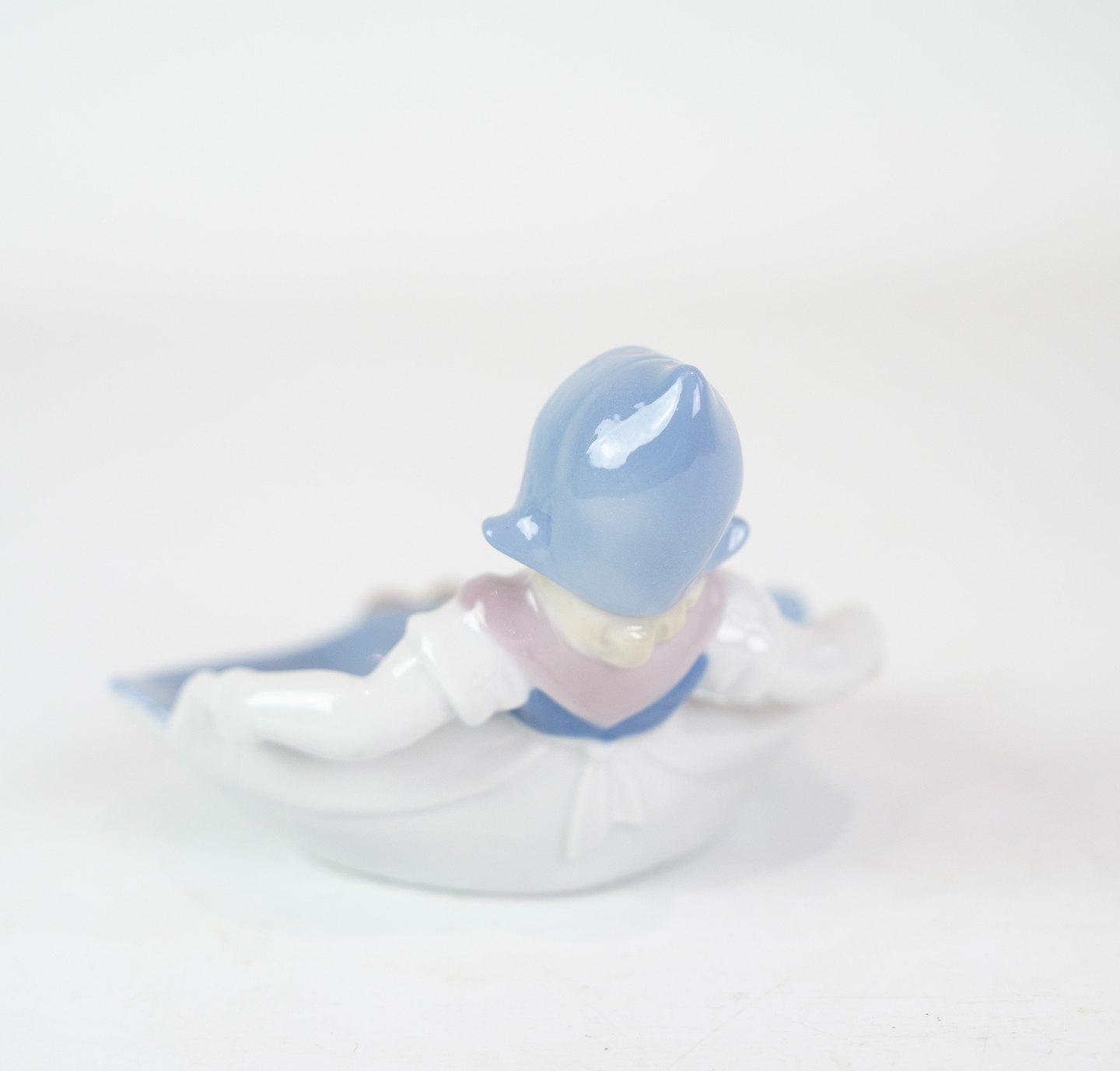 Figur af porcelæn med motiv af siddende pige i uniform, som kan benyttes som lille skål nr. 1087