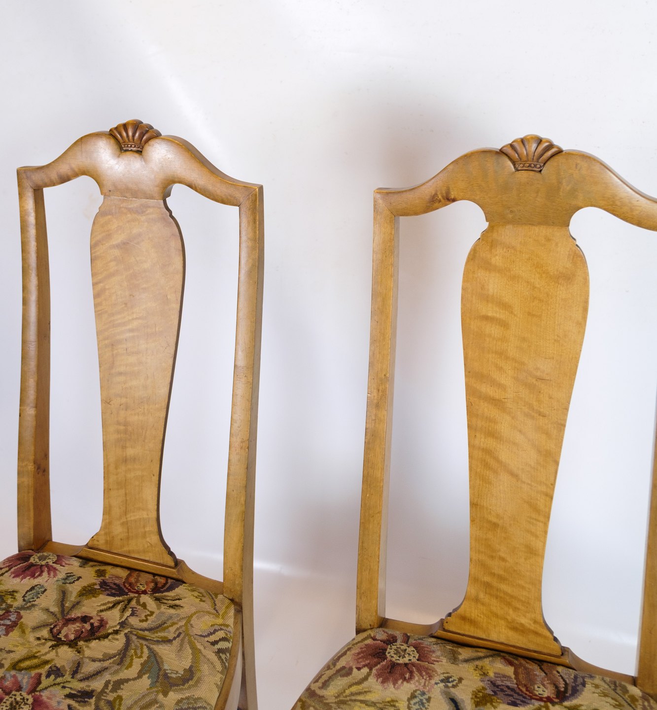 Antikke spisestuestole i Birketræ med lyst stof betræk fremstillet i rokoko stil fra omkring 1920'erne.